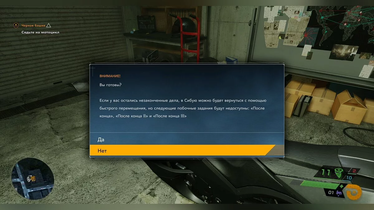 Если сразу же взаимодействовать с мотоциклом, то герой сможет вернуться в город позднее, однако побочные задания «После конца», «После конца 2» и «После конца 3» будут недоступны. Рекомендуется рассеять туман в западной части игрового мира и выполнить эти квесты до отправления в Чёрную башню. Они помогут лучше узнать историю КК. После использования мотоцикла глава будет завершена.