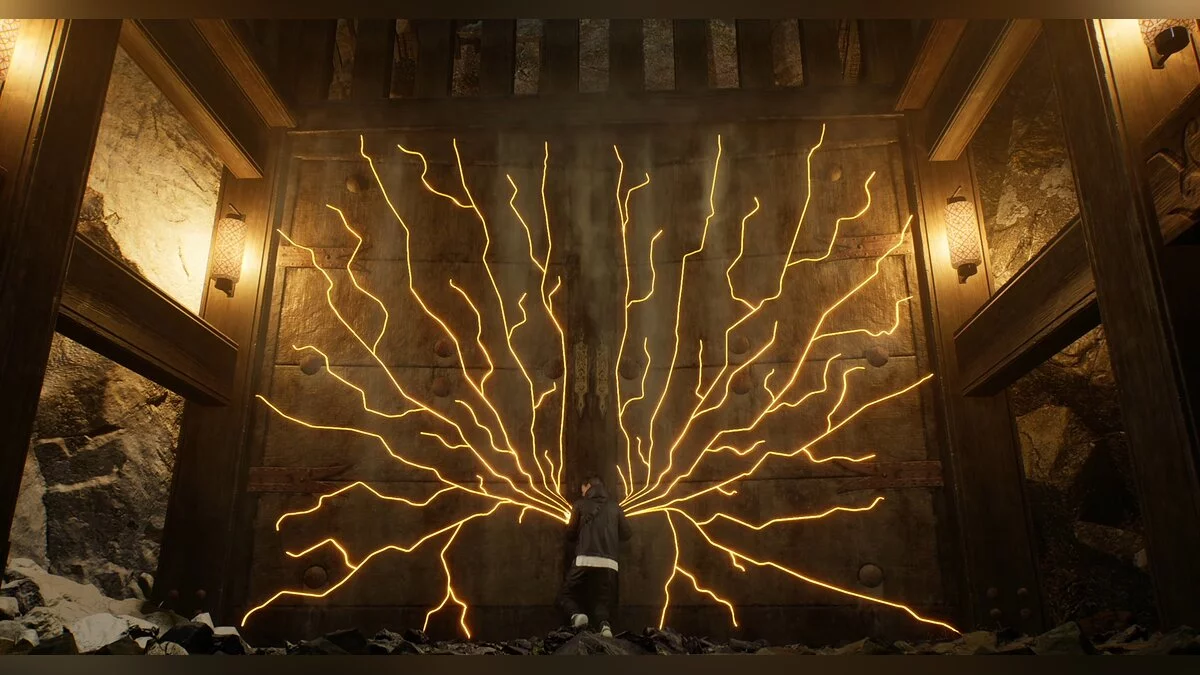 Оказавшись в заснеженной локации, поднимаемся выше и выходим к большим воротам.