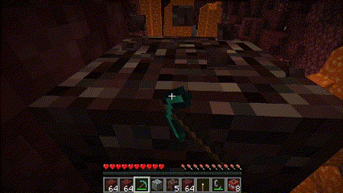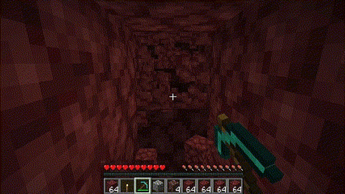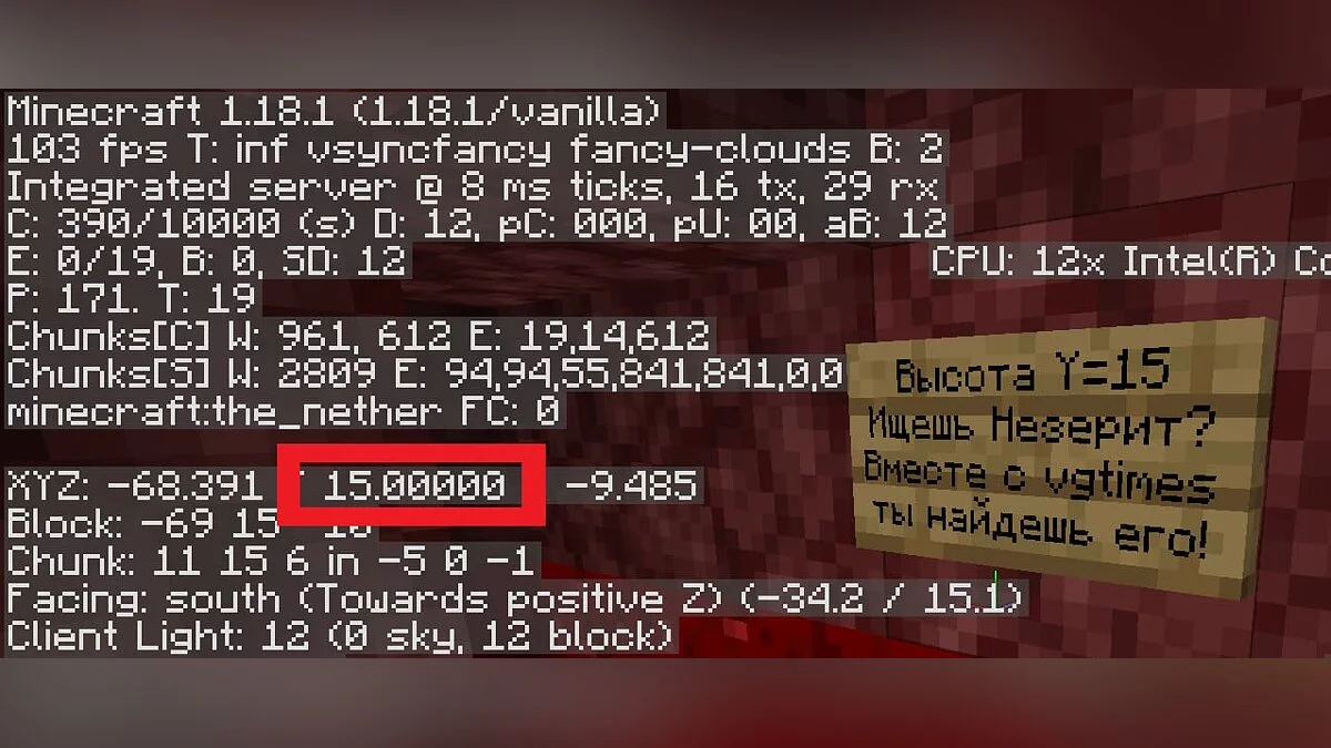 Древние обломки чаще всего генерируются на высоте Y=15 блоков. Увидеть координаты можно, нажав F3. Спускаемся на эту высоту и начинаем копать шахту.