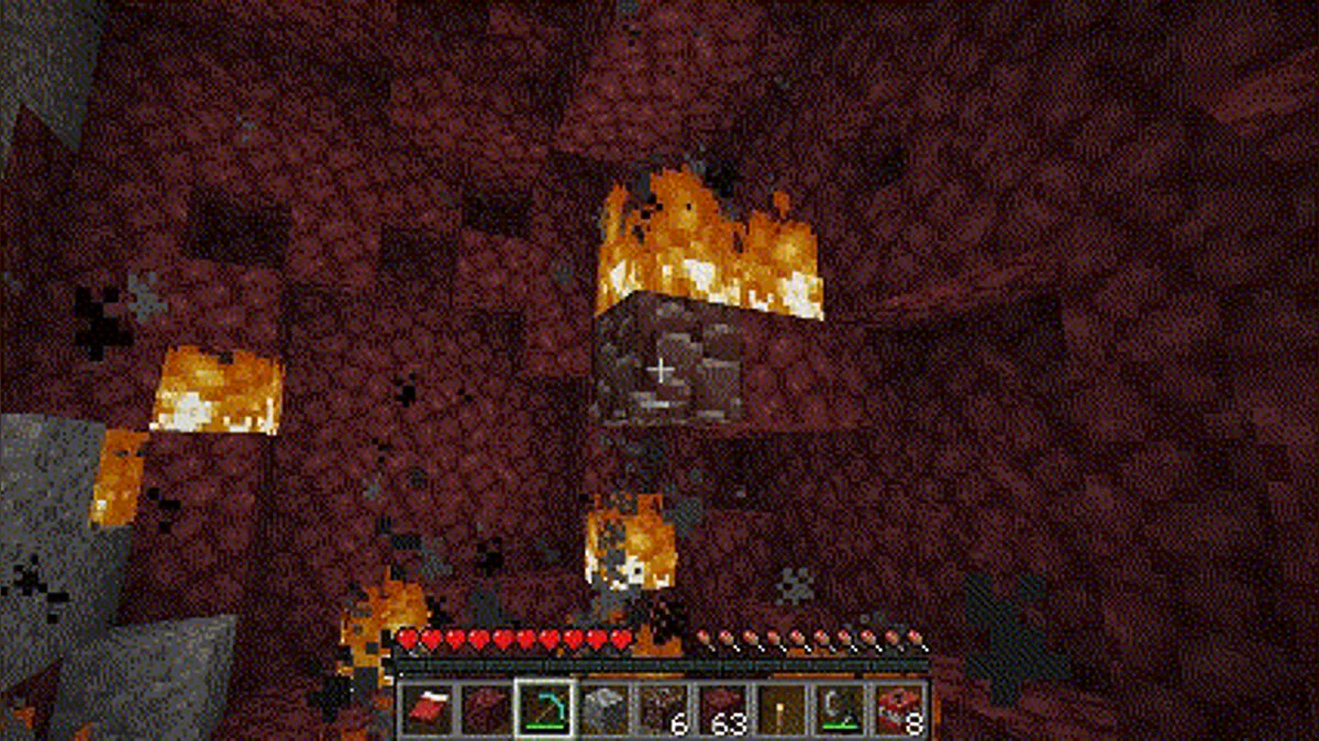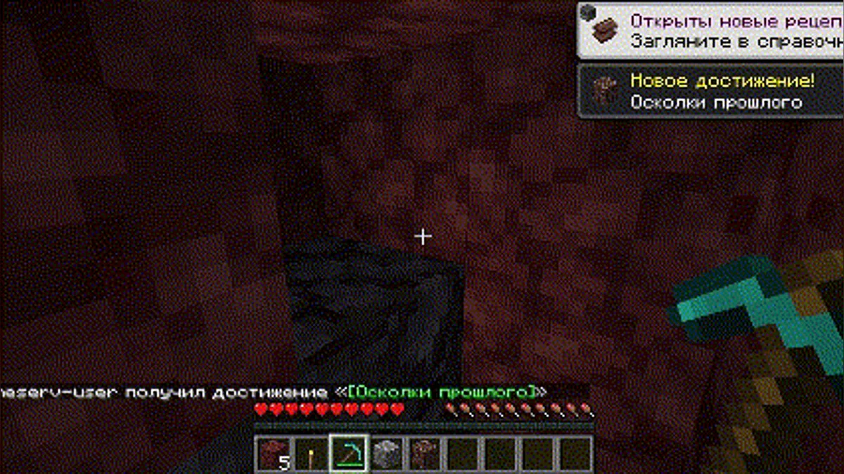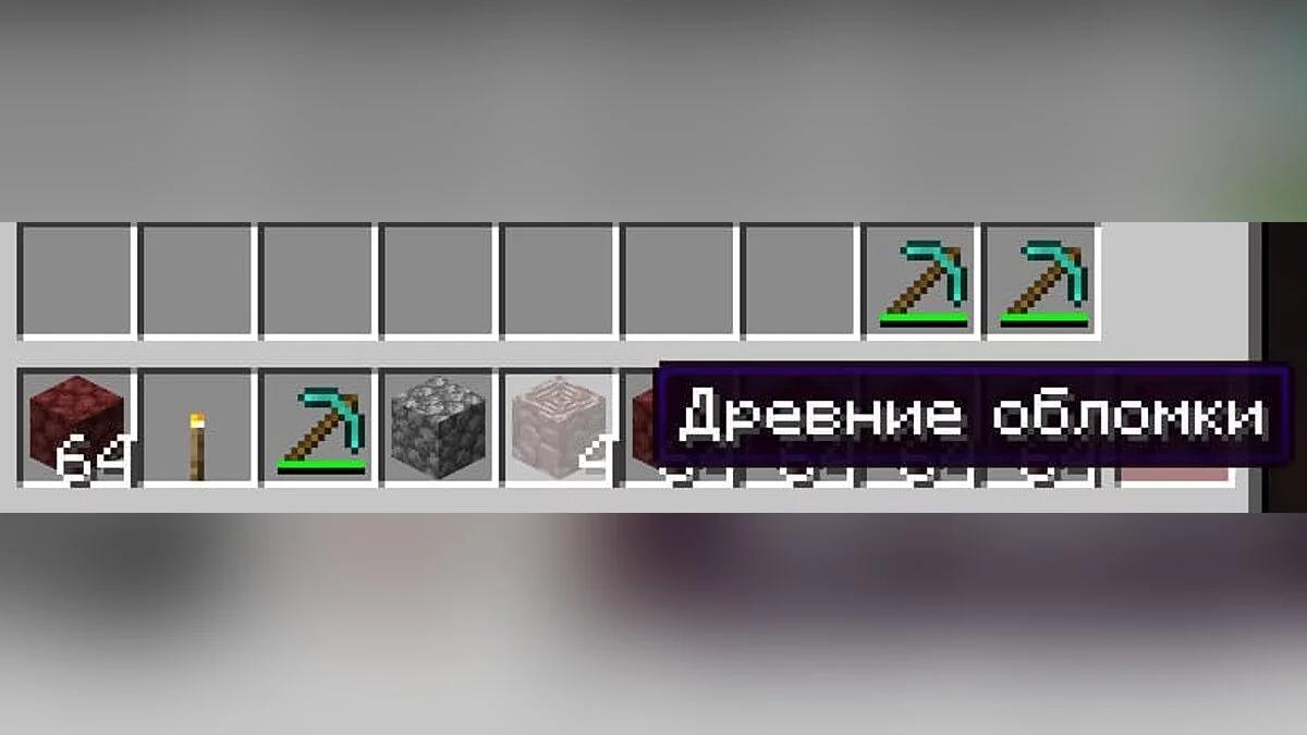 Добыча начинается с древних обломков. Это руда, из которой можно получить незерит. Для добычи нам понадобится алмазная или незеритовая кирка. Если попытаться добыть руду другими инструментами, ничего не получится, и кирка сломается.