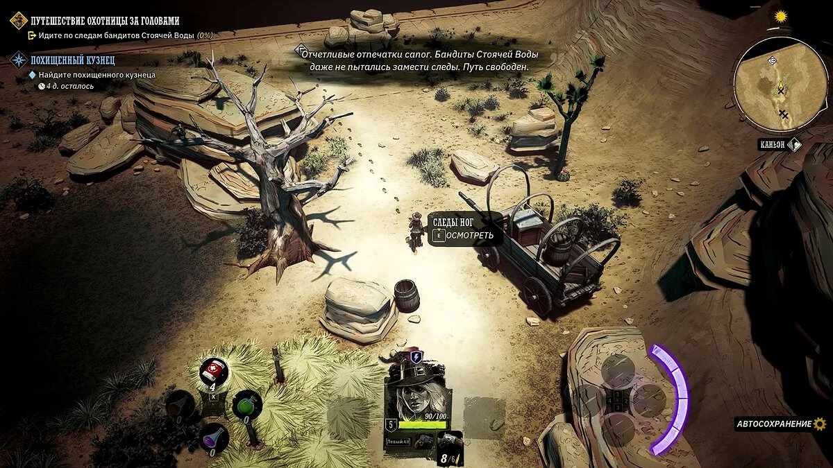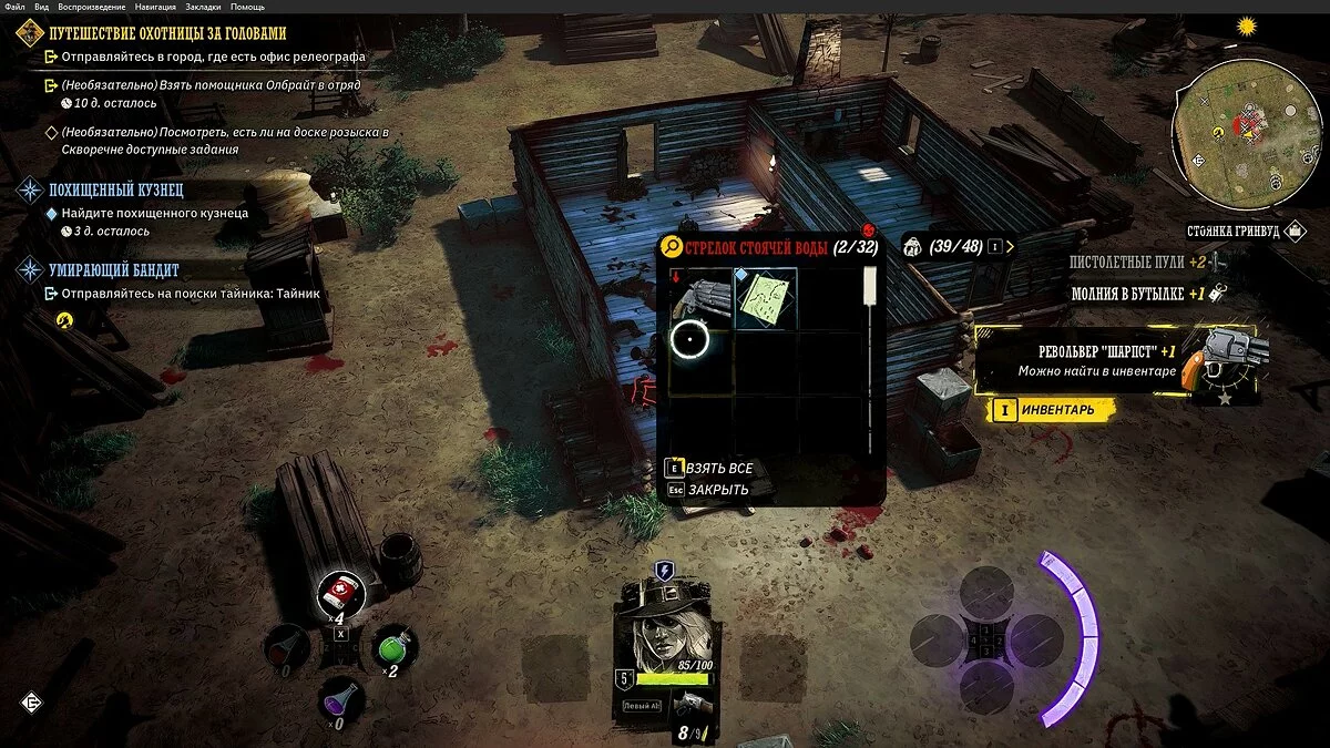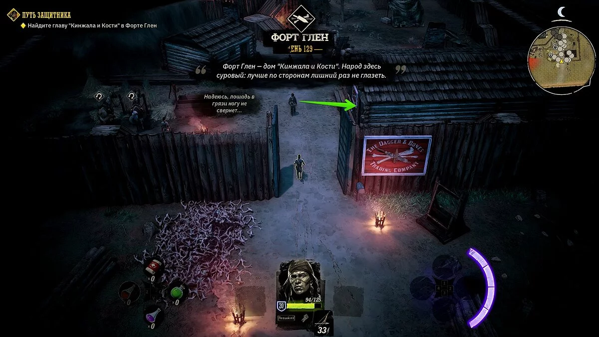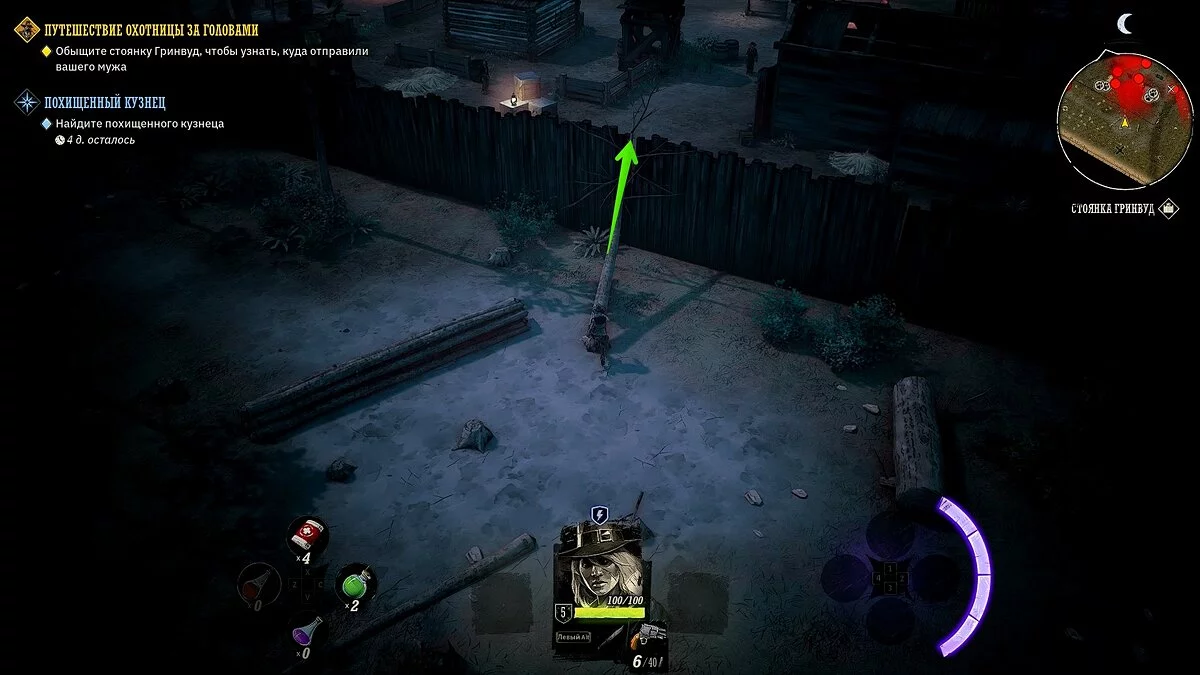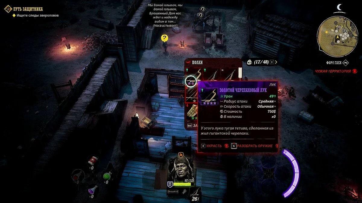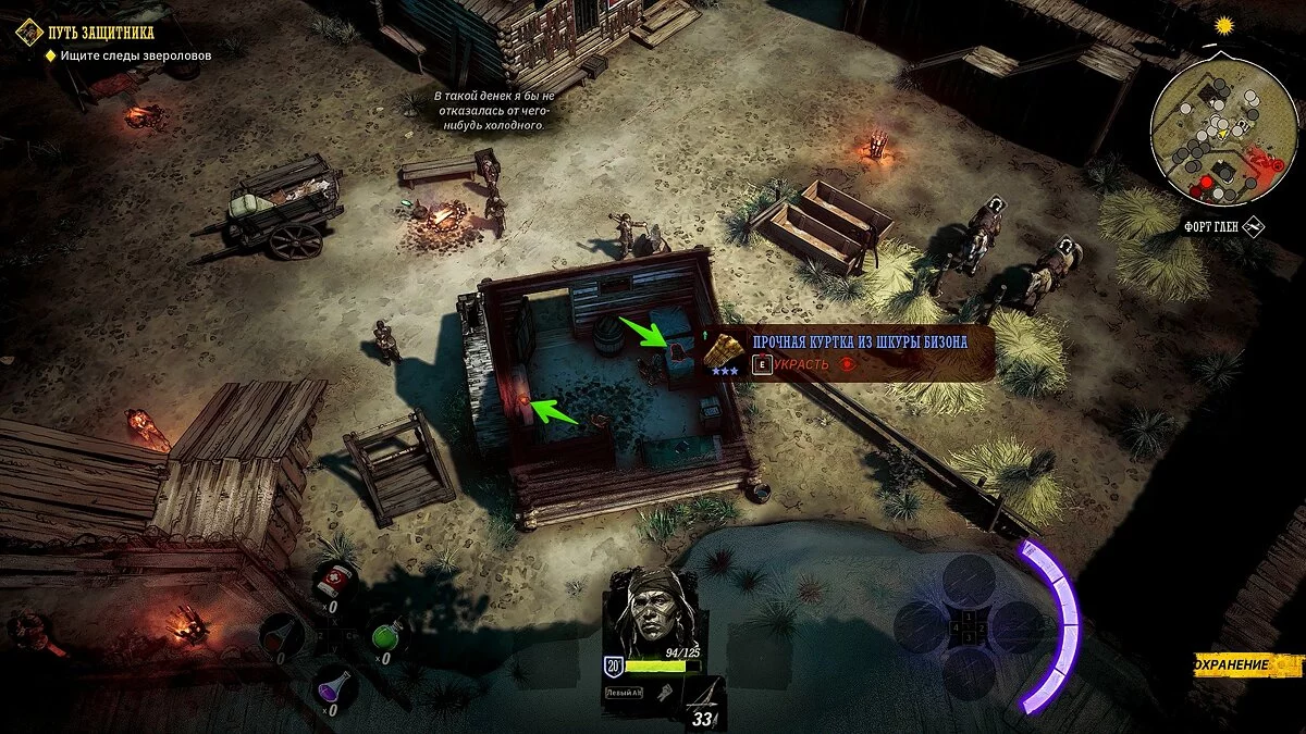 У вашего героя из оружия только лук и несколько десятков стрел. Учитывая, что при перемещении на вас часто будут нападать прожоры, мы рекомендуем добраться до ближайшего города, нафармить деньги и украсть хорошее оружие и куртку. Советуем украсть лучший лук и броню у портного в локации «Форт Глен», куда вы прибудете по сюжету. Как безнаказанно воровать в Weird West мы рассказали здесь.