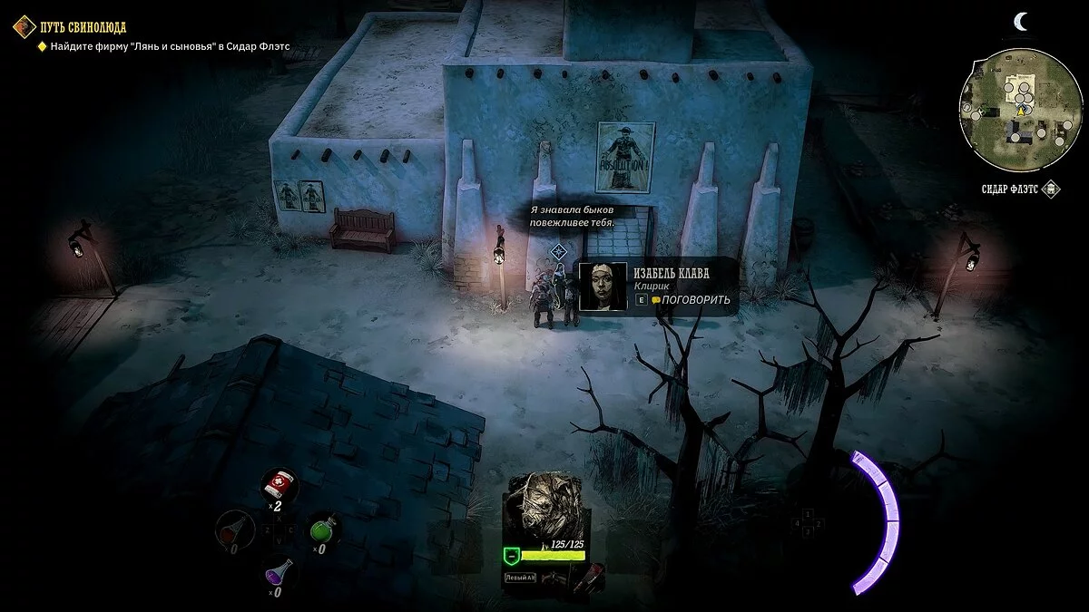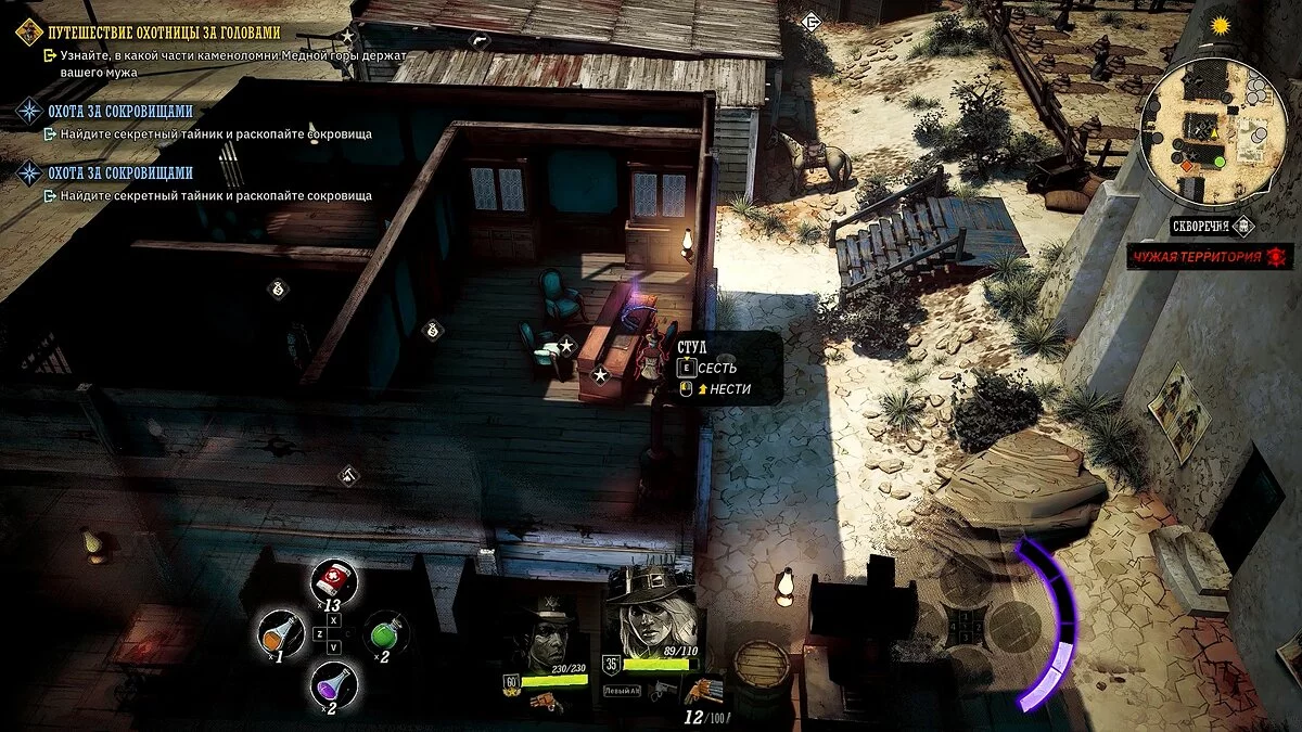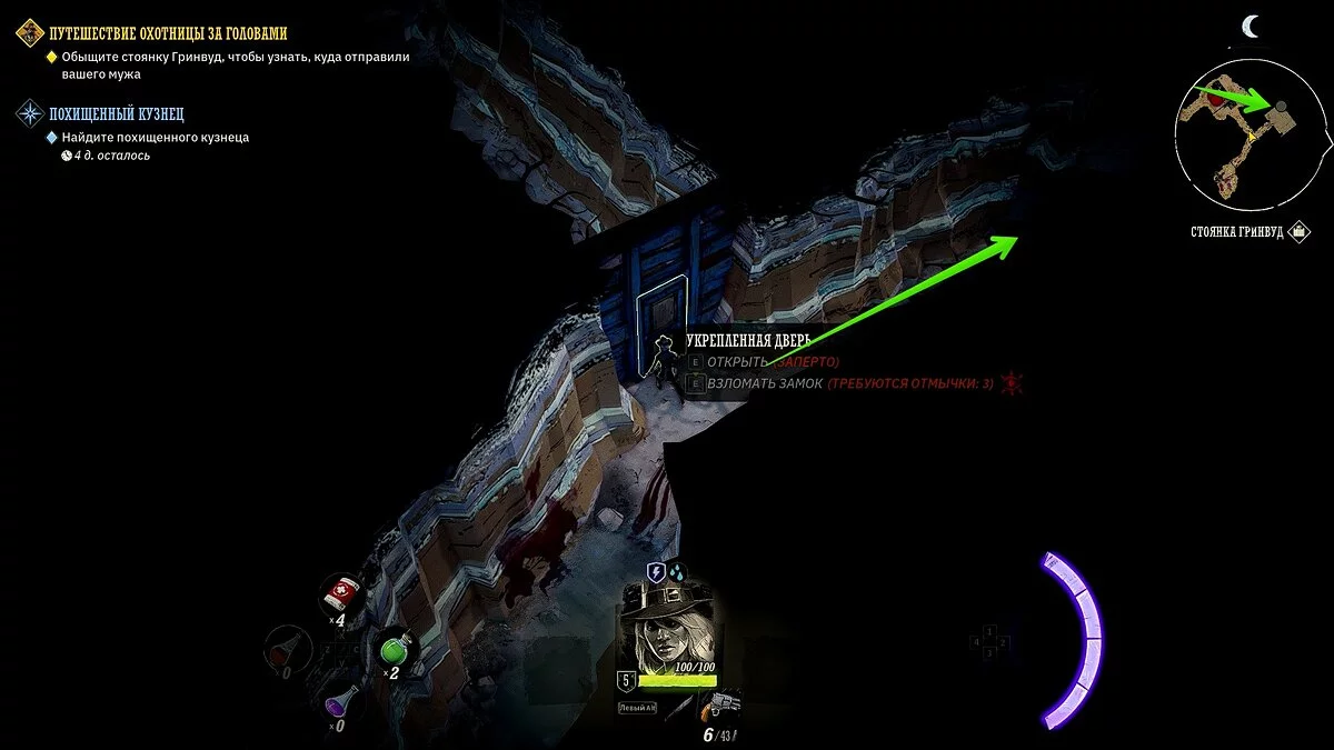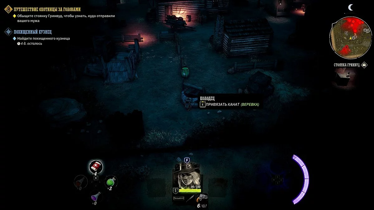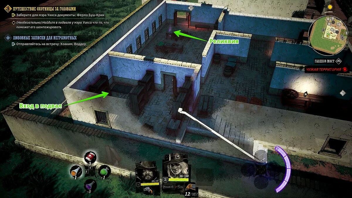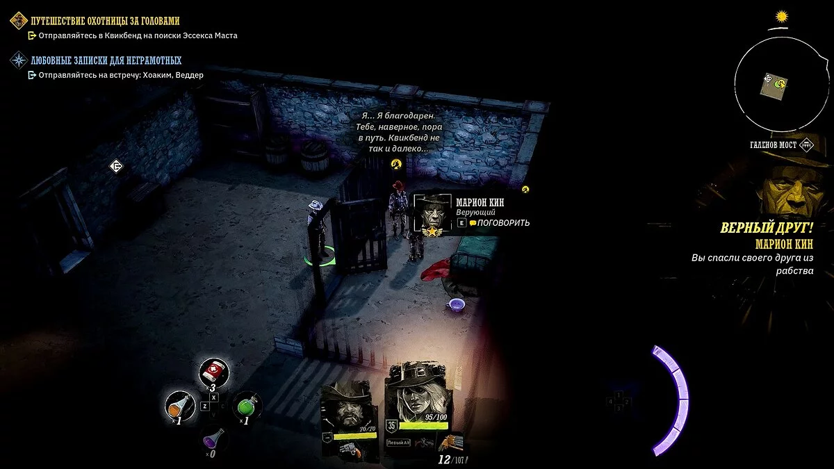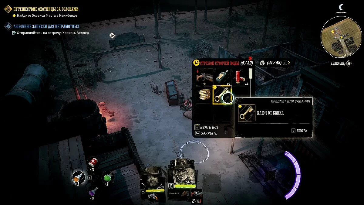 У вашего героя из оружия только лук и несколько десятков стрел. Учитывая, что при перемещении на вас часто будут нападать прожоры, мы рекомендуем добраться до ближайшего города, нафармить деньги и украсть хорошее оружие и куртку. Советуем украсть лучший лук и броню у портного в локации «Форт Глен», куда вы прибудете по сюжету. Как безнаказанно воровать в Weird West мы рассказали здесь.