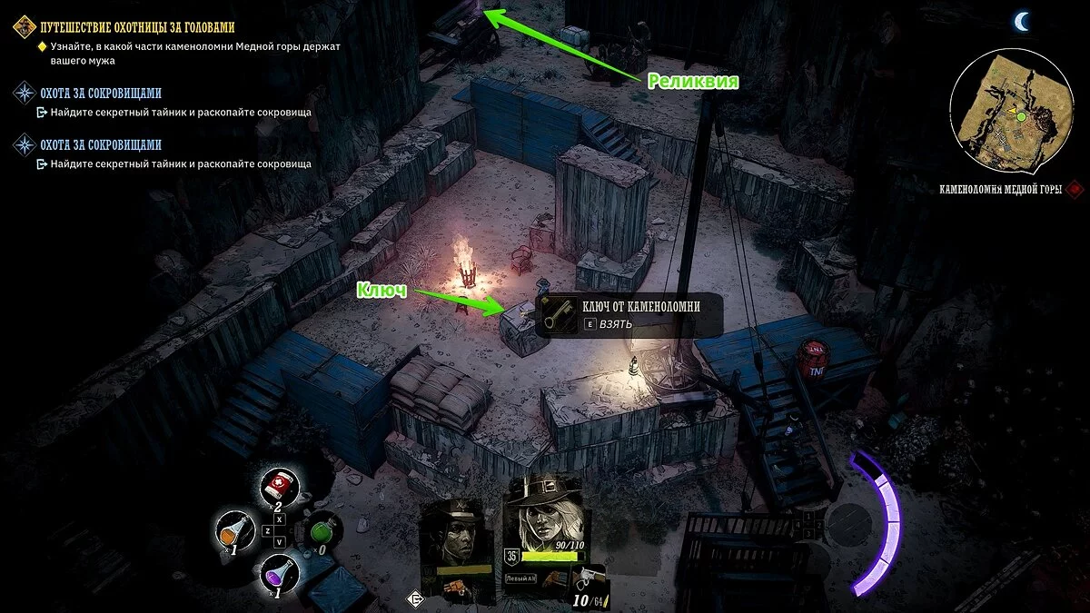 Отправляйтесь в локацию с каменоломней и избавьтесь от разбойников. Слева от входа в шахту найдите ключ на ящике, а также окаменелую реликвию на телеге.