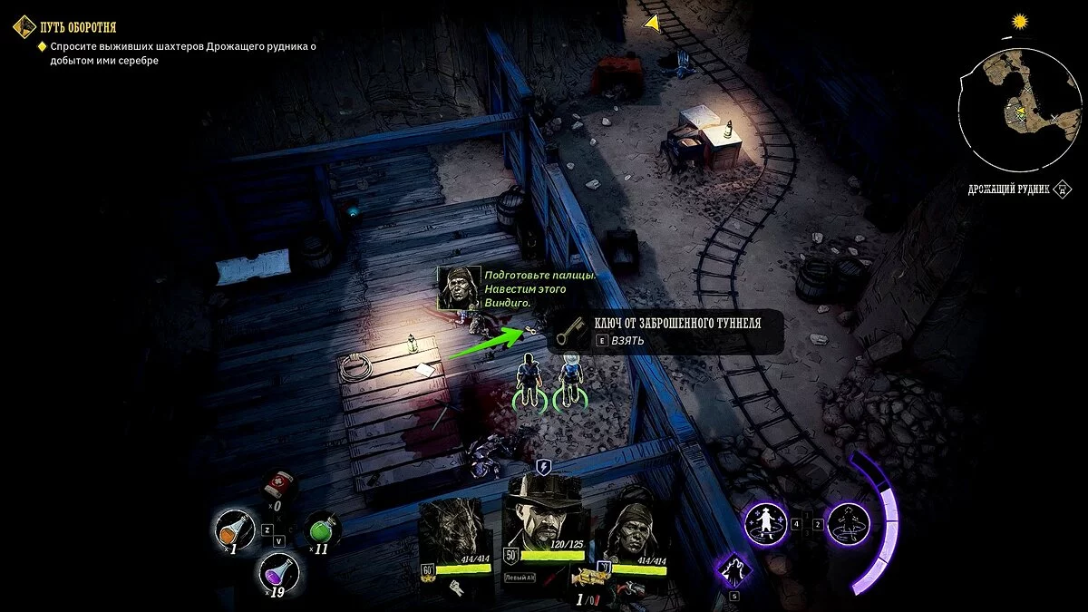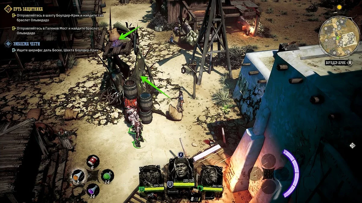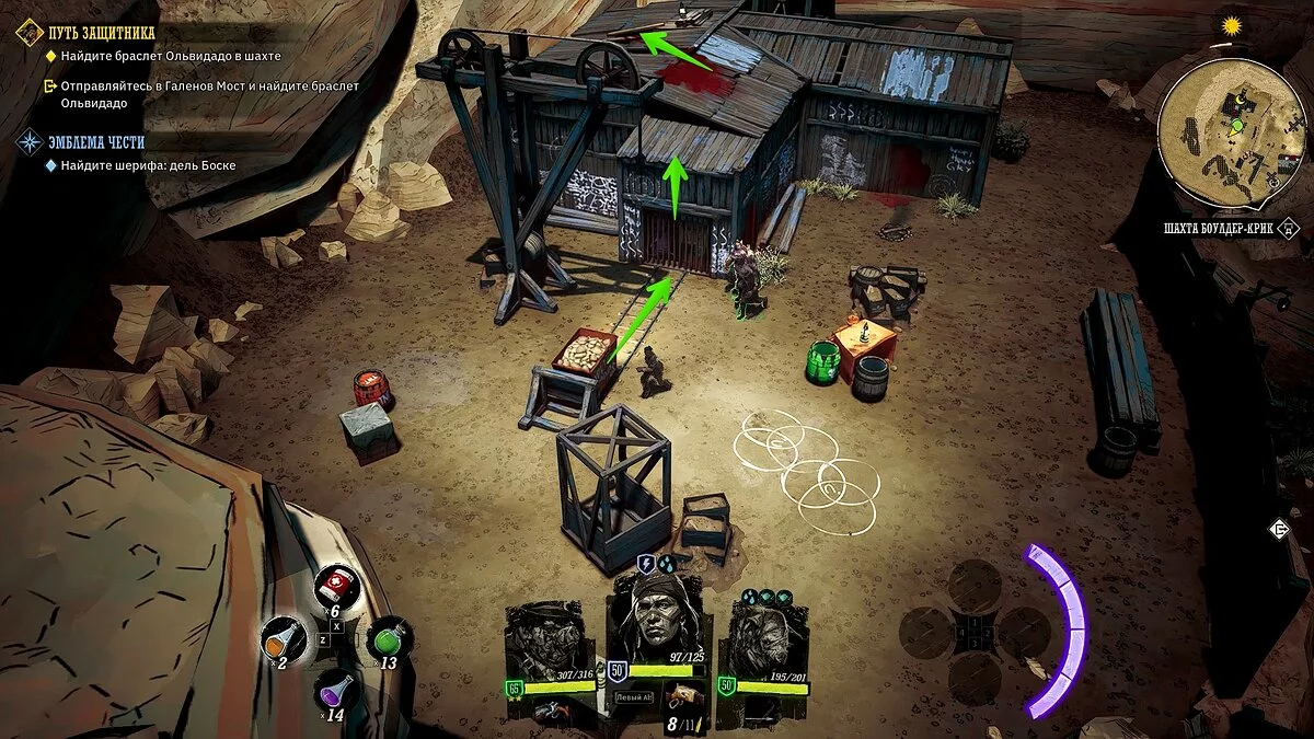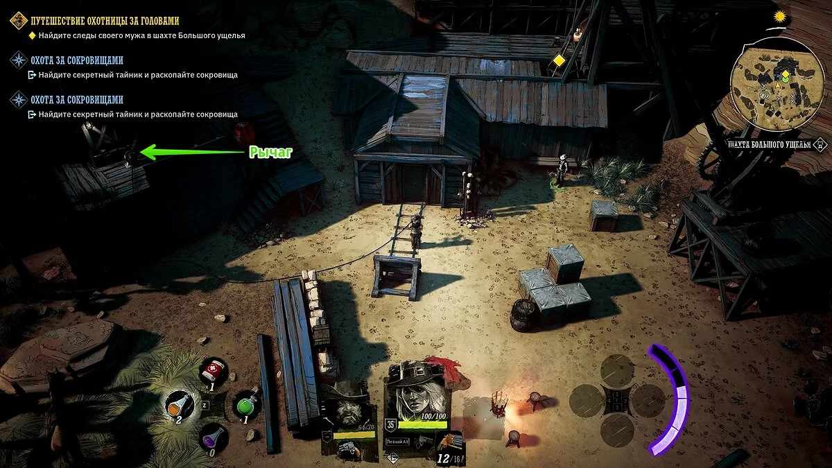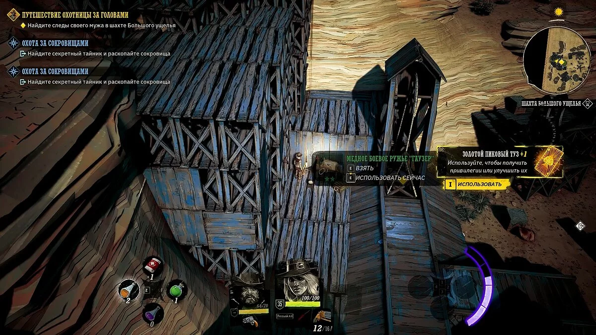 Двигайтесь в указанную локацию и разберитесь с бандитами. Активируйте рычаг слева от входа в шахту и взорвите укреплённую дверь. Если осмотреть крышу здания, то можно найти «золотой пиковый туз» и медное ружьё, о котором мы писали ранее.