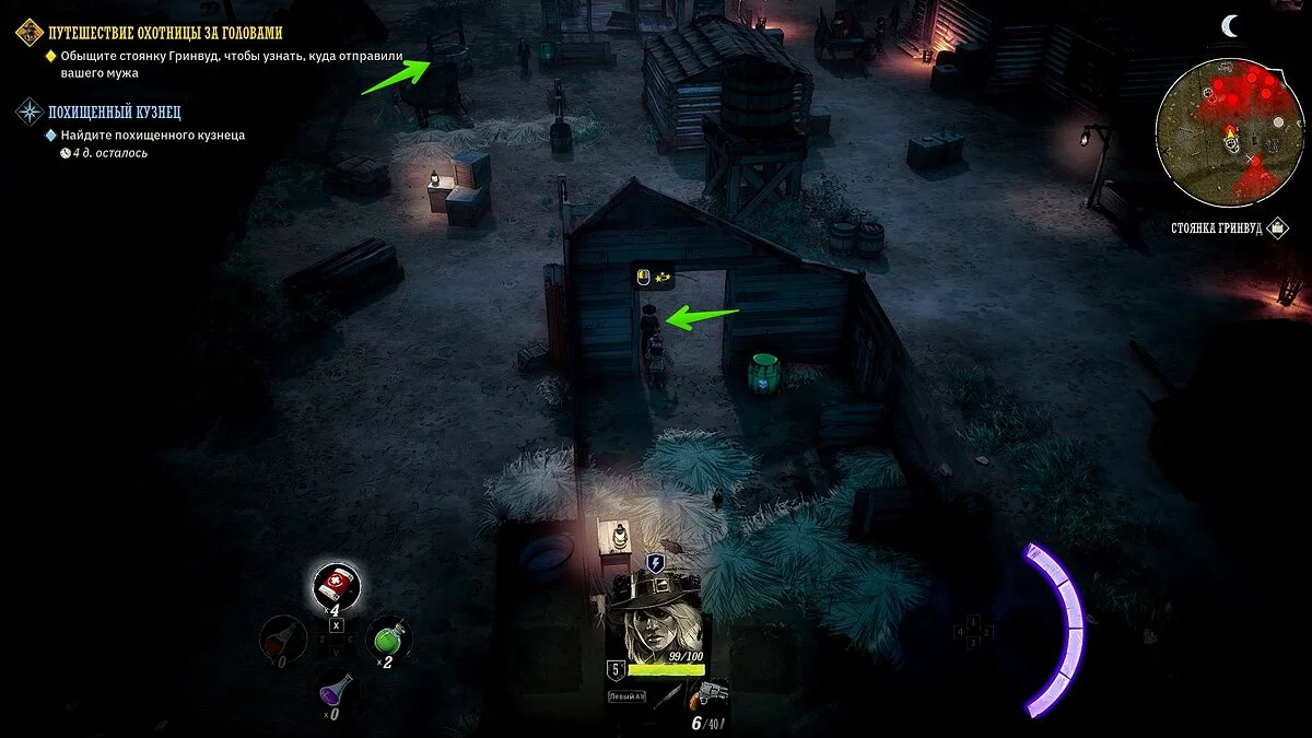 Здесь осмотрите труп стрелка справа от здания. Заберите золотой самородок и динамит. Поговорите с девочкой, после чего отправляйтесь за маркером в другую локацию. Так вы окажетесь на стоянке «Гринвуд».