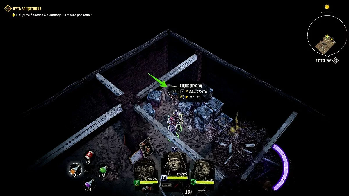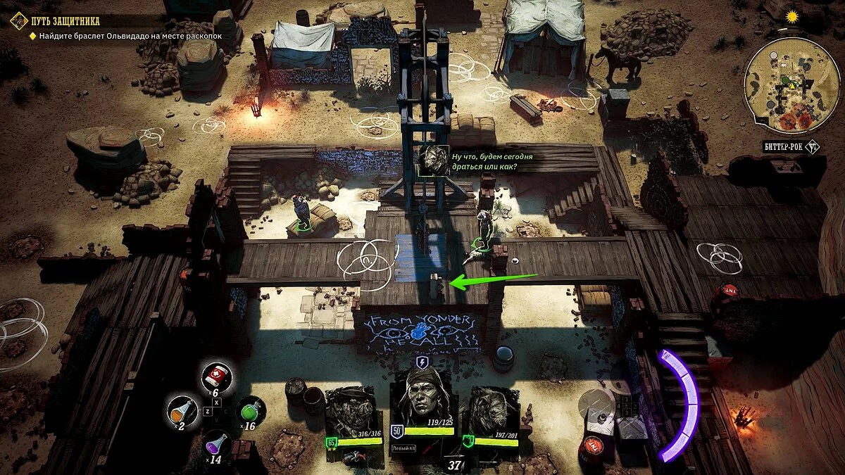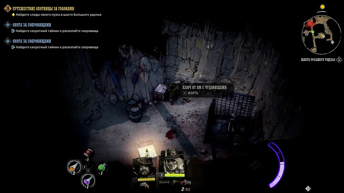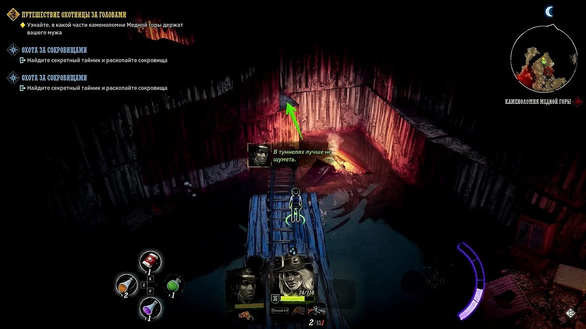 Осмотрите караван с припасами искателей сокровищ. Убейте двух прожор, в телеге подберите «золотой пиковый туз» и найдите записку в ящике. Отправляйтесь в локацию Биттер-Рок, разберитесь с прожорами на поверхности и осмотрите локацию. Потяните за рычаг, спуститесь в подземелье.
