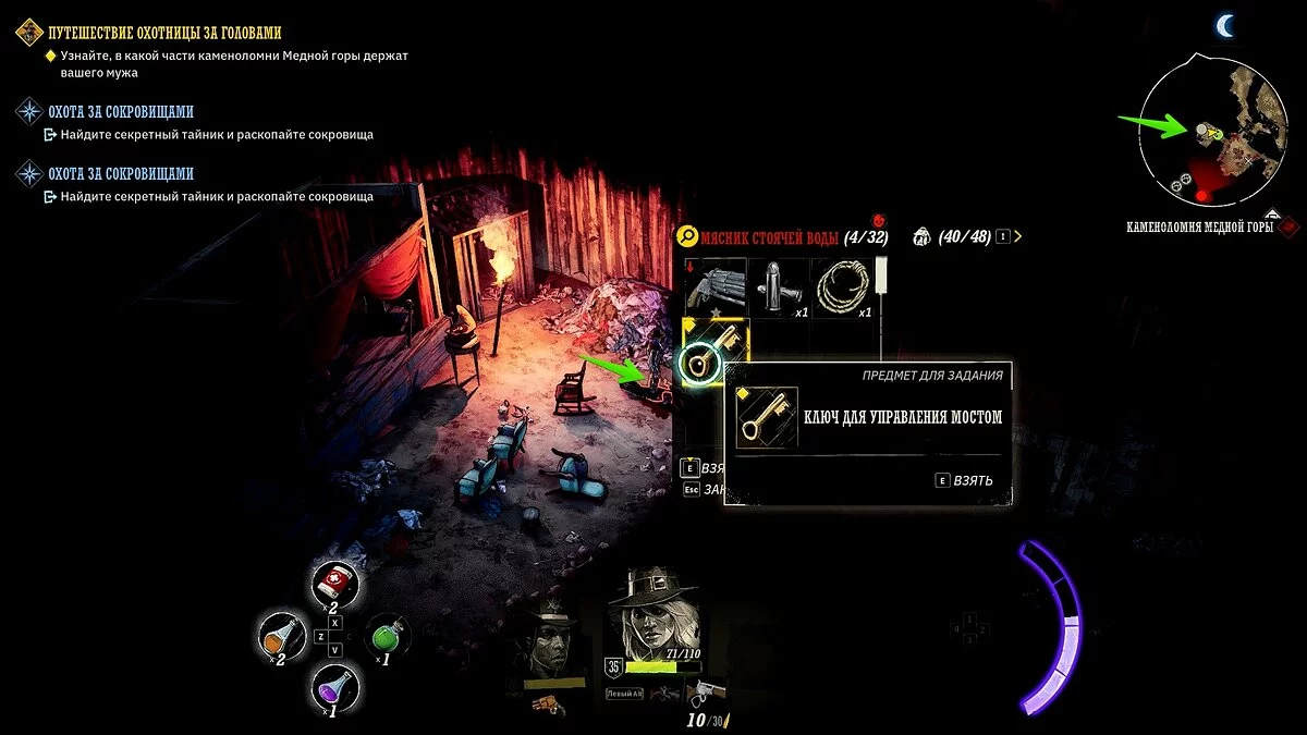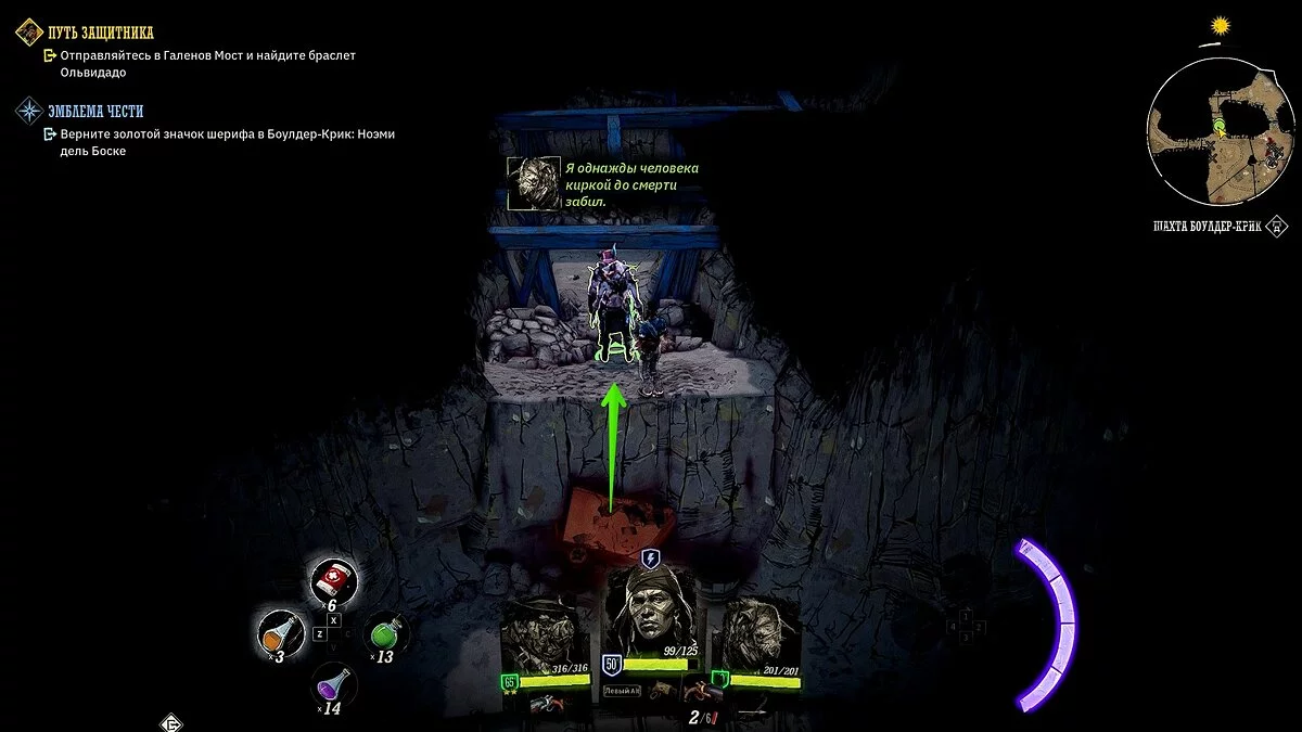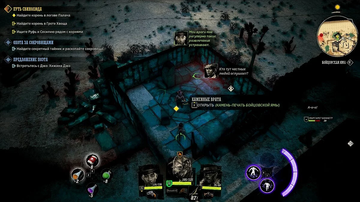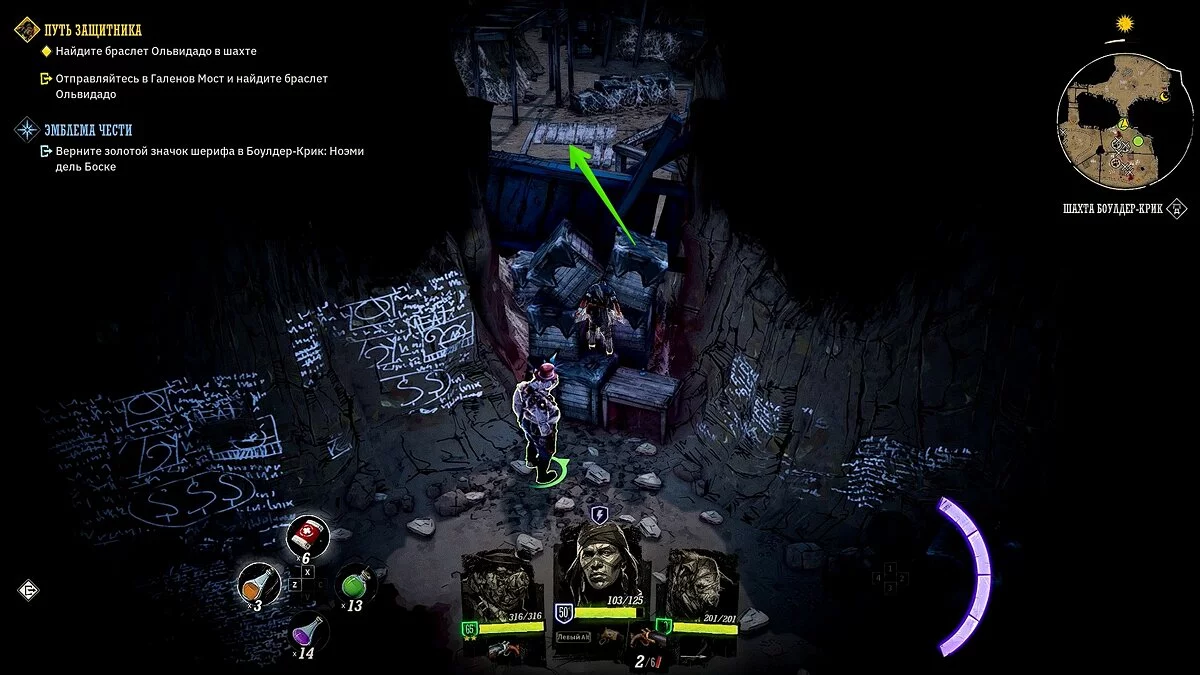 Осмотрите караван с припасами искателей сокровищ. Убейте двух прожор, в телеге подберите «золотой пиковый туз» и найдите записку в ящике. Отправляйтесь в локацию Биттер-Рок, разберитесь с прожорами на поверхности и осмотрите локацию. Потяните за рычаг, спуститесь в подземелье.