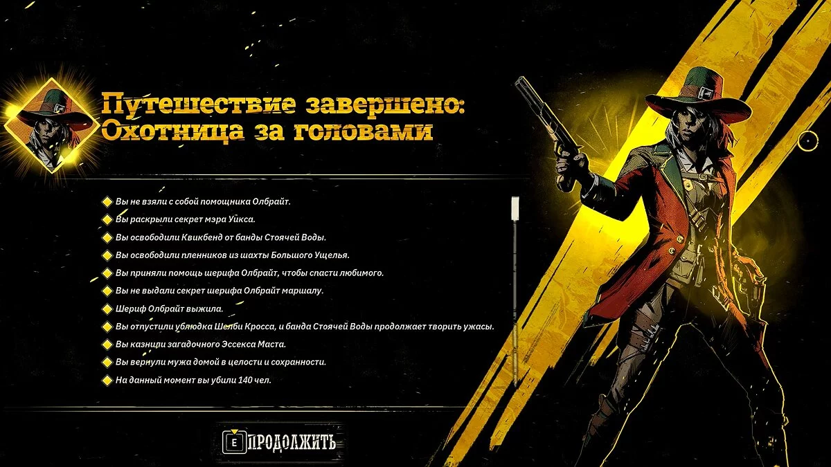 Используйте найденный ключ, активируйте рычаг и поговорите с мужем. Покиньте пещеру, чтобы встретиться с маршалом. Если сохраните тайну шерифа Олбрайт, то она будет вам благодарна. На этом кампания Охотницы за головами завершится.