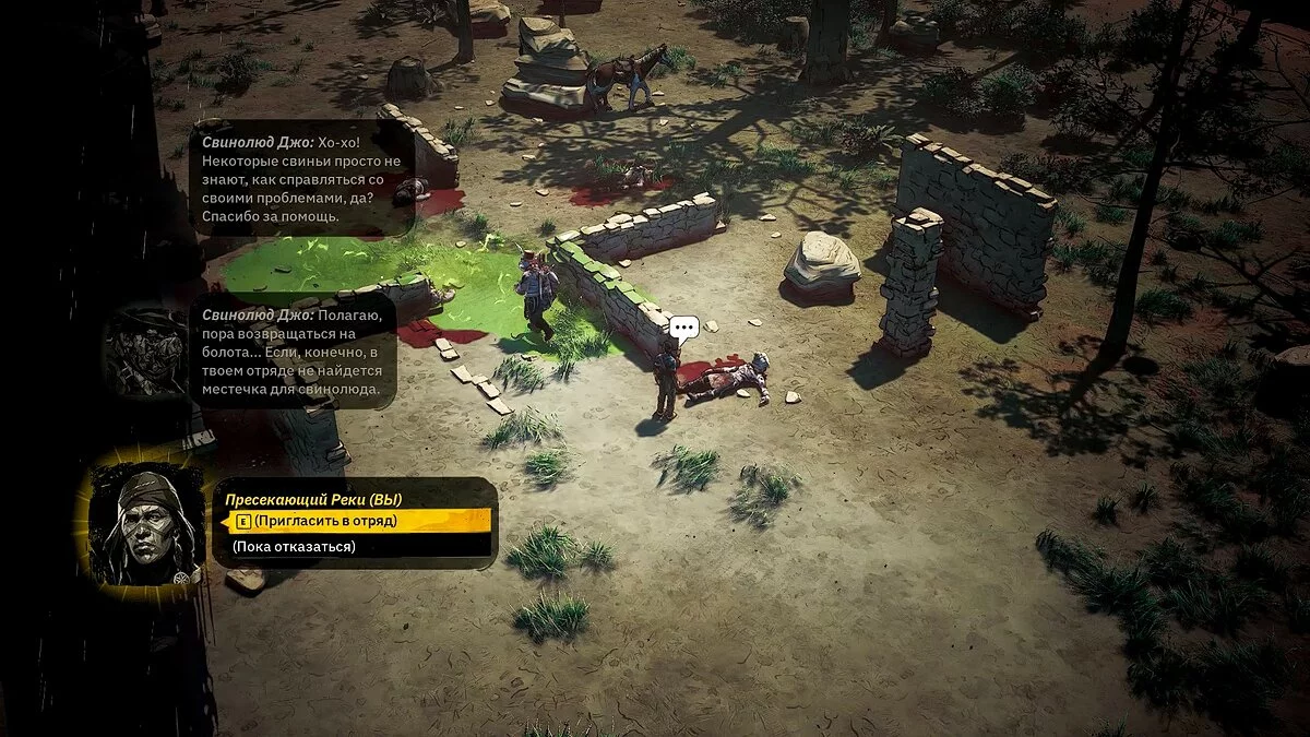 После осмотра следов откроется новая локация «Караван с припасами искателей сокровищ». По пути вы встретите Свинолюда Джо, по случайному событию «Конец игры». Если поможете ему, то он попросится к вам в отряд. Также вы можете взять в свой отряд Охотницу за головами или Свинолюда из предыдущей истории.