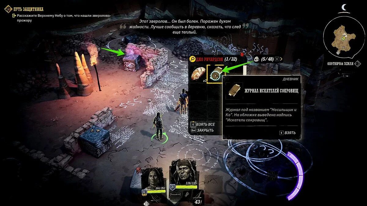 Поговорите с кузеном и спуститесь в пещеру. Убейте прожору Билла Клоуза, заберите окаменелую реликвию и прочтите журнал искателей сокровищ. Резной сундук можно открыть позже, когда вы найдёте отмычку.