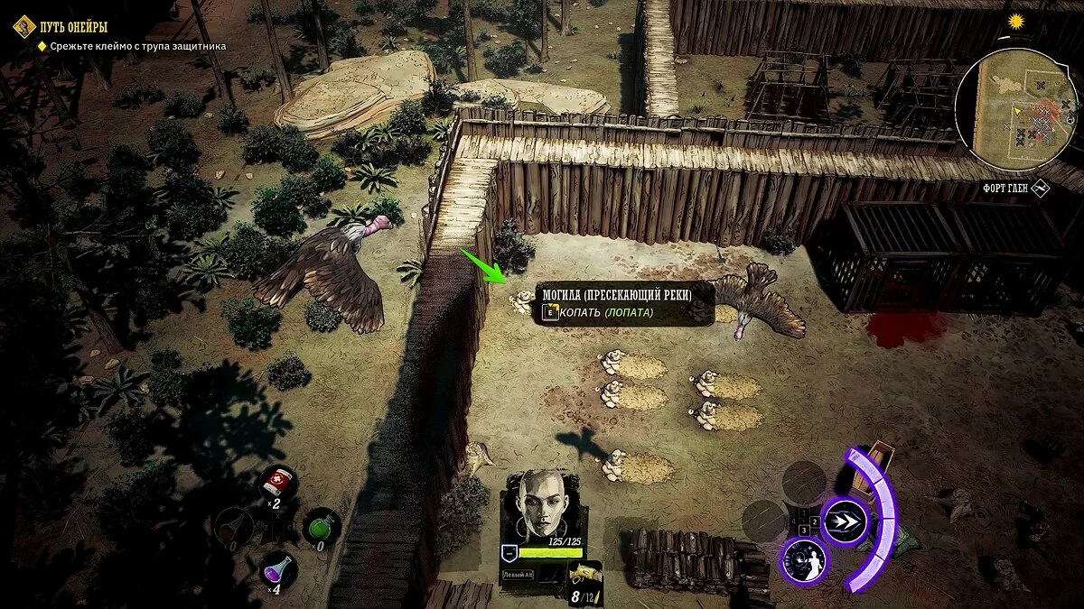 Мы рекомендуем обойти лагерь по левой стороне и забраться на поваленное дерево, затем перепрыгнуть на птичье гнездо. Так вы сможете попасть на стены форта и добраться до могилы. Заберите клеймо с трупа защитника и вернитесь в храм Разорённых Прерий.