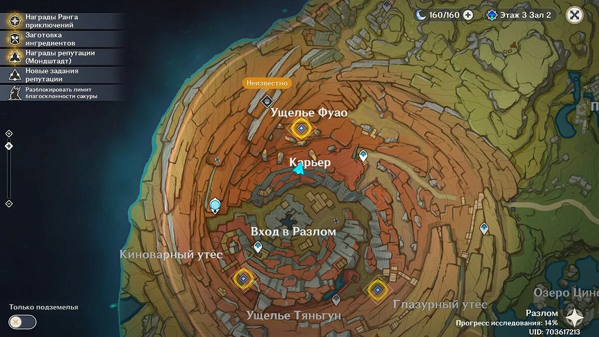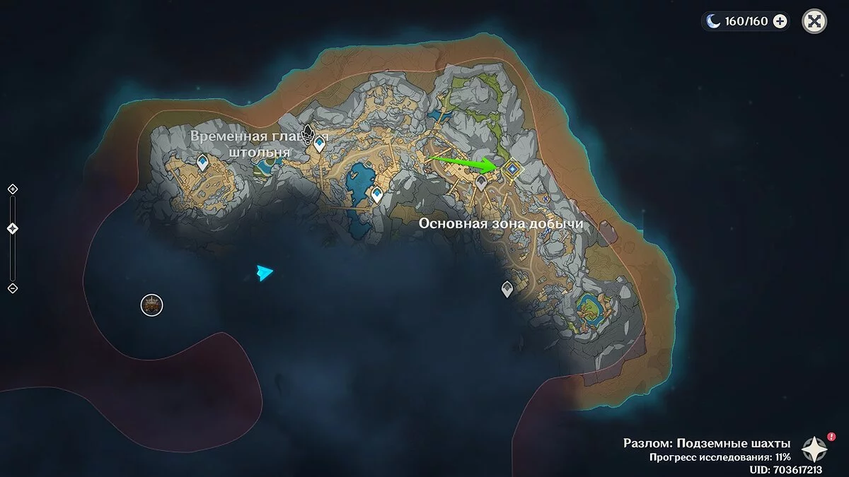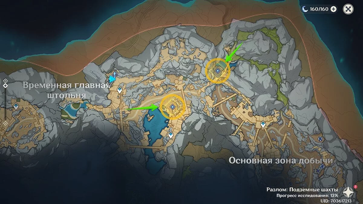 Отправляйтесь ко входу в Разлом и активируйте подъемник. Вы окажетесь в новой области «Разлом: подземные шахты». Пока вы добираетесь до отмеченного места, обязательно собирайте Светоносные кристаллы. С их помощью вы можете улучшать устройство «Адъювант светоносного камня». Делается это у Цзинь У.