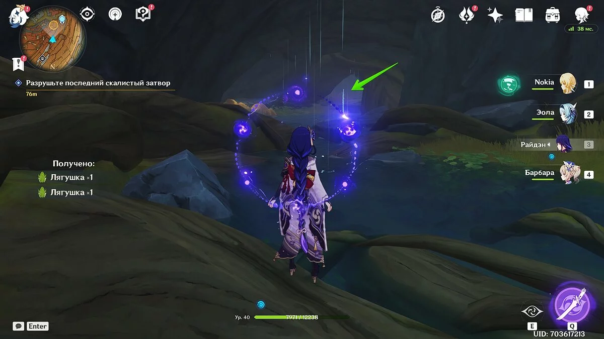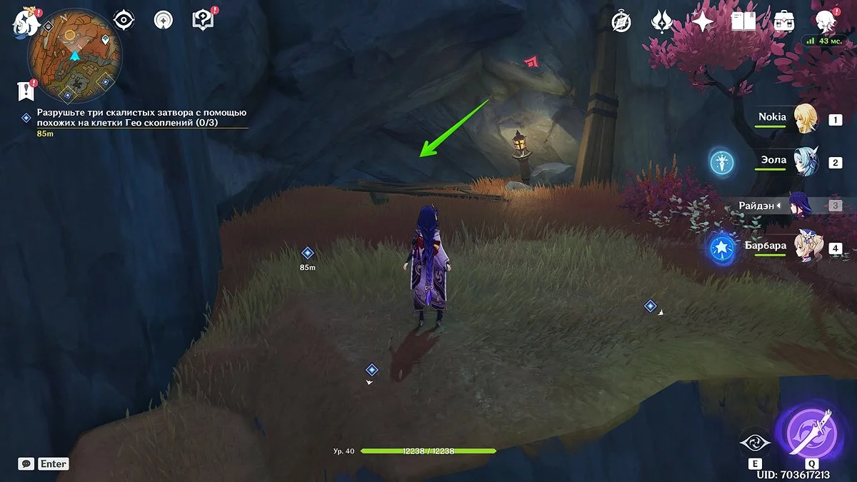 Открыв три затвора, вернитесь к искательнице приключений и получите координаты последнего. Он находится неподалёку от статуи Гео Архонта на противоположной стороне Разлома.