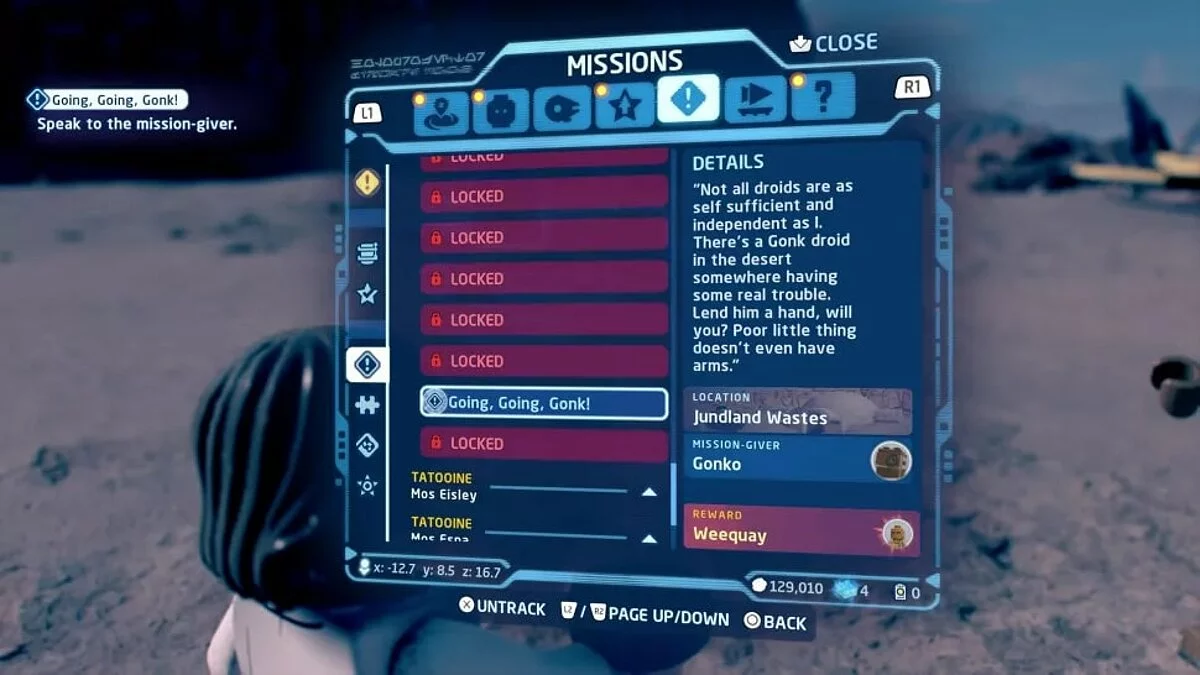 Во вкладке уровня на голопроекторе игрок может ознакомиться с количеством найденных предметов коллекционирования и выполненными квестами. Не стоит беспокоиться о завершении всех заданий во время первого прохождения — на многих уровнях от пользователя потребуется наличие специальных персонажей и способностей. Выполнить такие задачи можно позднее в режиме свободной игры.