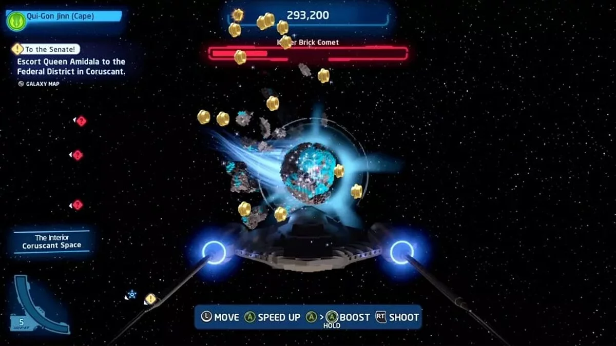 Игрок сможет уничтожить кайбер-кометы для получения монеток и кайбер-кирпичиков. Можно вступить в космические сражения и получить немного денег. Также рекомендуется поучаствовать в гонках на время. При получении золотой медали можно открыть новых персонажей и корабли.