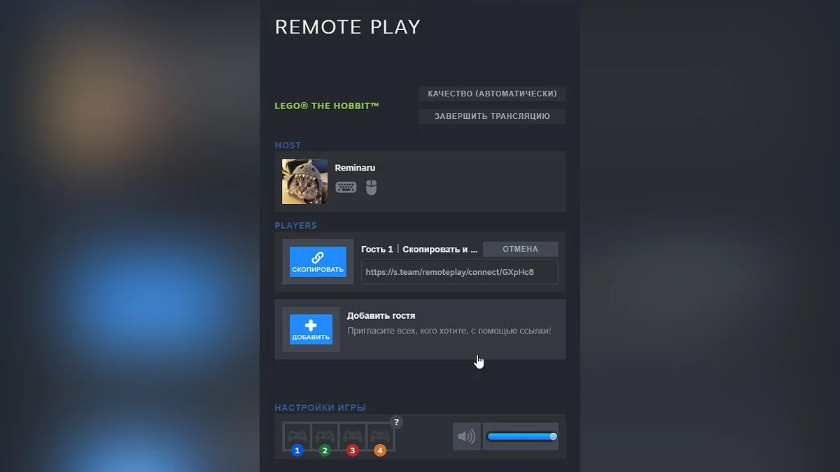 - Откроется окно удалённого воспроизведение (Remote Play), в котором необходимо скопировать ссылку и отправить её другу. Также можно нажать кнопку «Добавить гостя», чтобы позвать пользователя Steam напрямую.