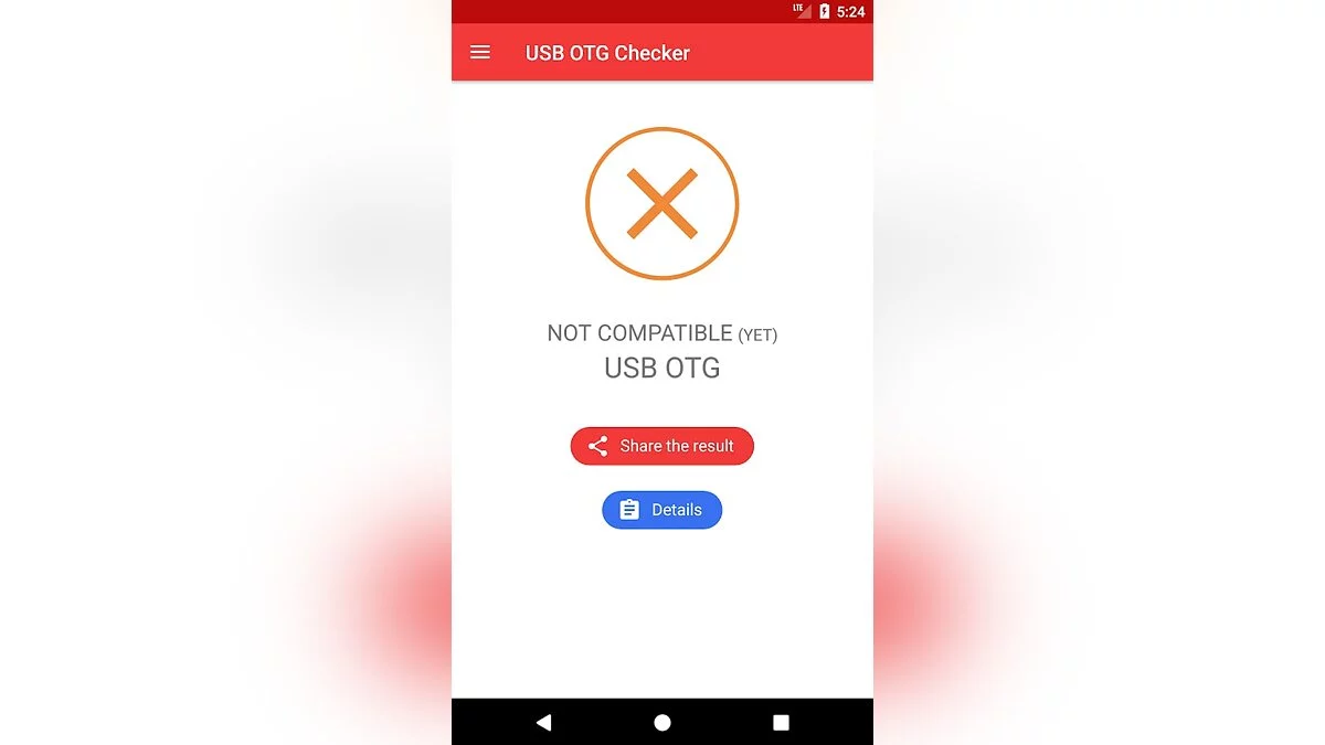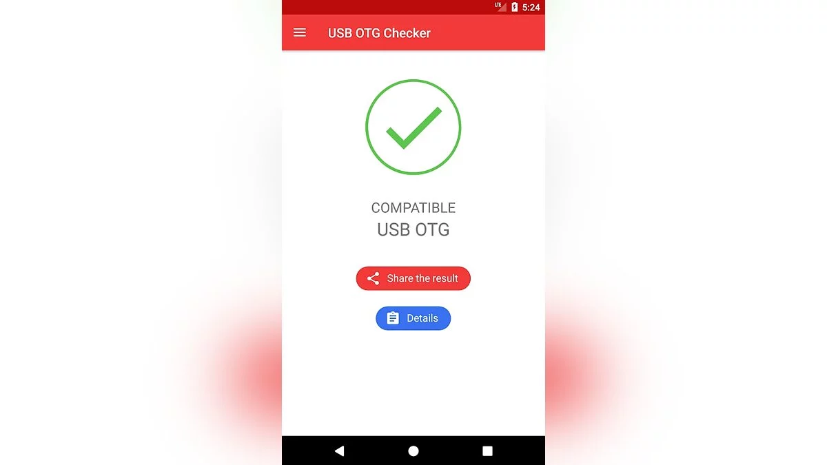- Если устройство поддерживает технологию USB OTG, то на экране отобразится зелёная галочка с надписью «Android Compatible USB OTG» или «Compatible USB OTG».