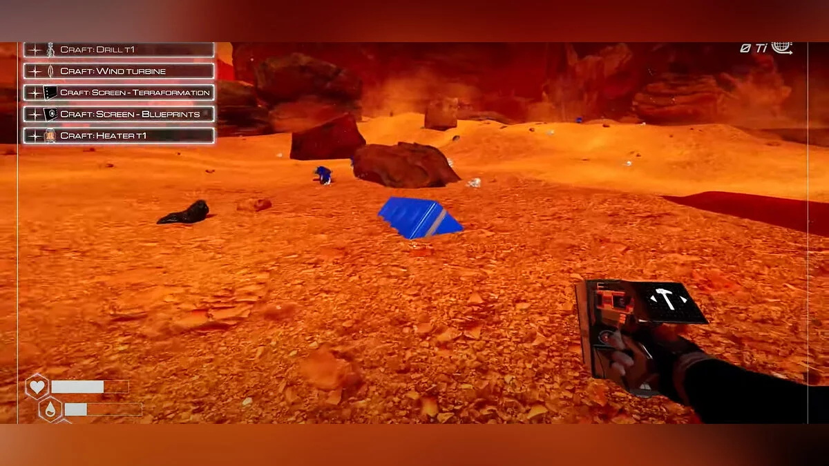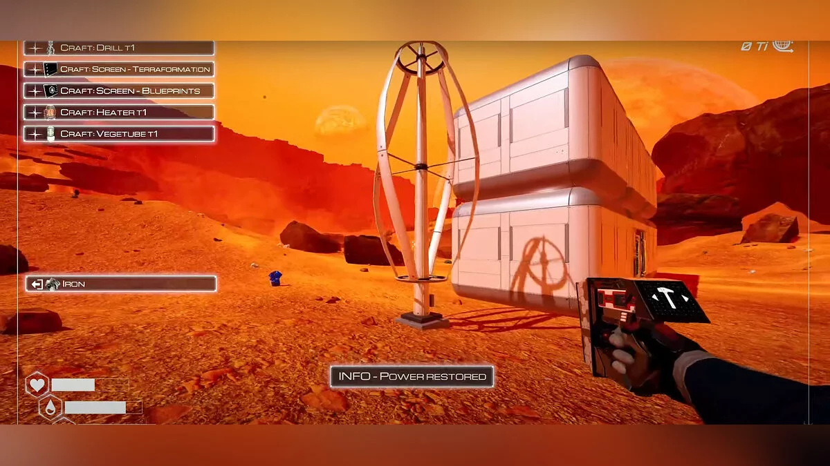 Первое, что вам необходимо сделать, чтобы начать изменения планеты — запустить процесс терраформирования. Для этого нужно построить сверло и обеспечить его энергией от ветряной турбины. Обе машины строятся из самых базовых ресурсов, поэтому их лучше скрафтить сразу несколько. Чем больше сверл одновременно будут работать, тем быстрее набираются очки терраформирования. После достижения 175 000 небо станет синим, появятся дожди и возможность засеять траву.