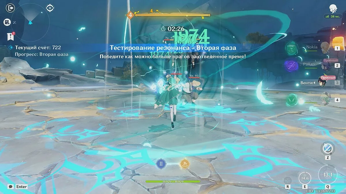 - Венти (пробный персонаж): этот герой будет основным во второй фазе испытания. Постоянно активируйте взрыв стихий персонажа, чтобы убивать огромное количество врагов за короткий промежуток времени.