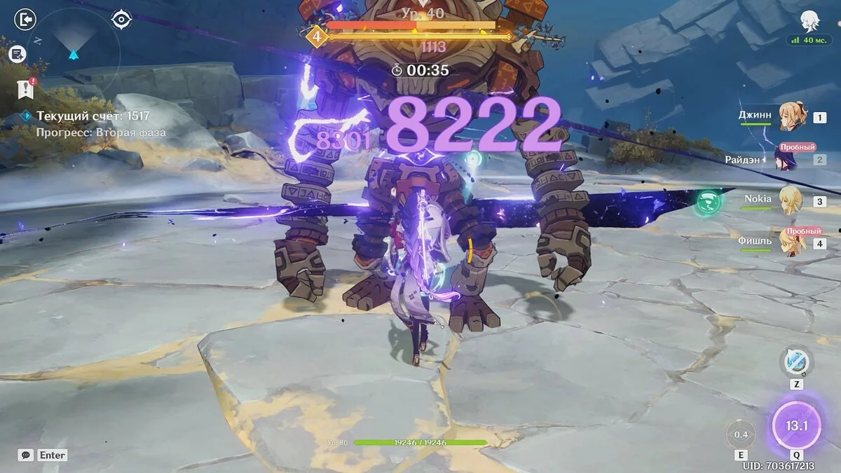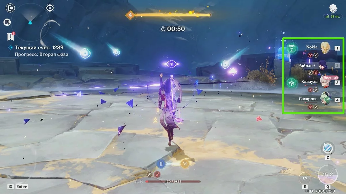 Атакуйте в основном пробным героем Итто. Переключайтесь на остальных бойцов, чтобы активировать элементальные способности и взрыв стихий. В этой фазе вы должны набрать не меньше 1000 очков.