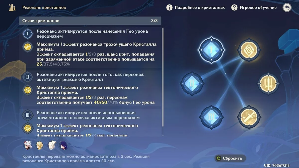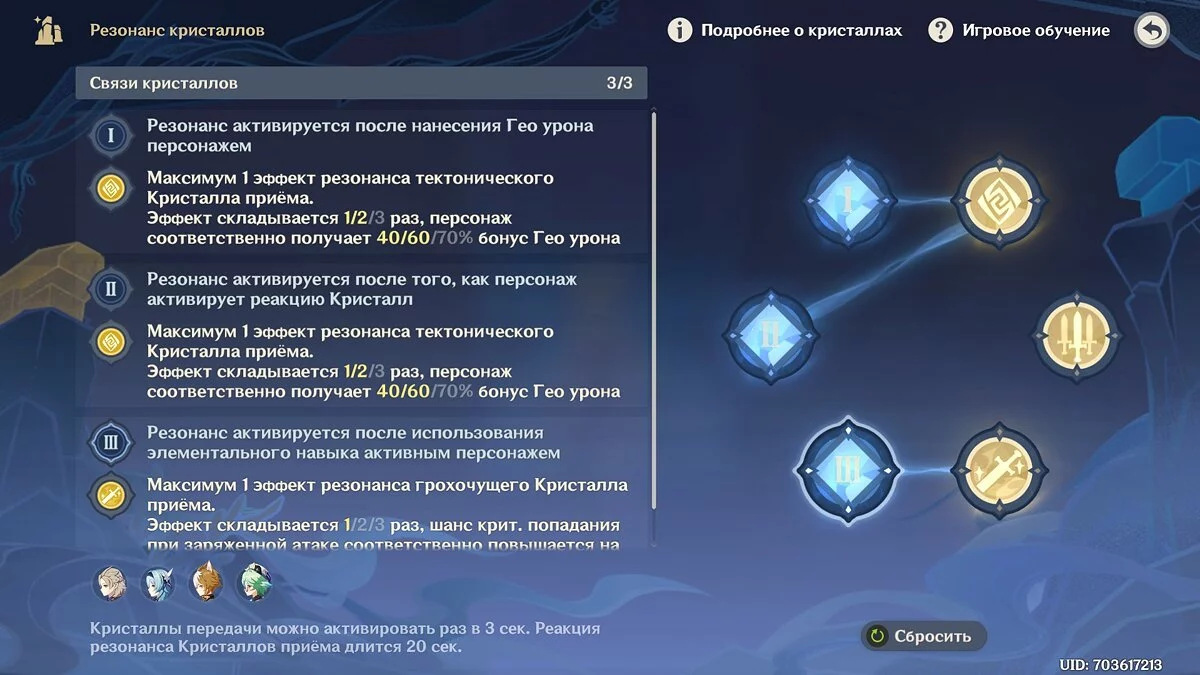 - Кристалл передачи навыков: резонанс активируется после использования элементального навыка активным персонажем. Активируется раз в 3 секунды;