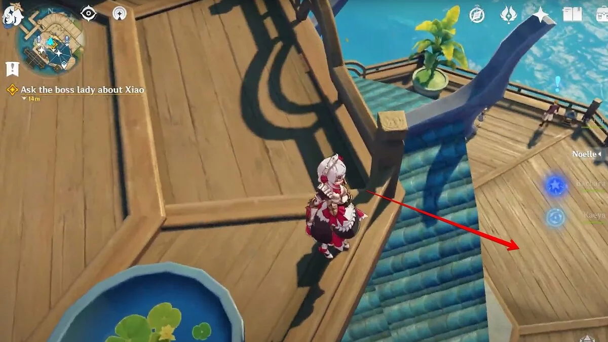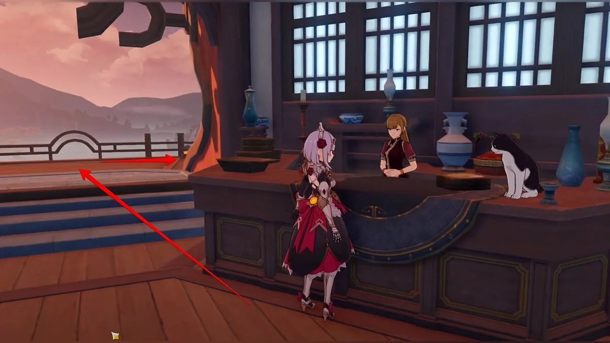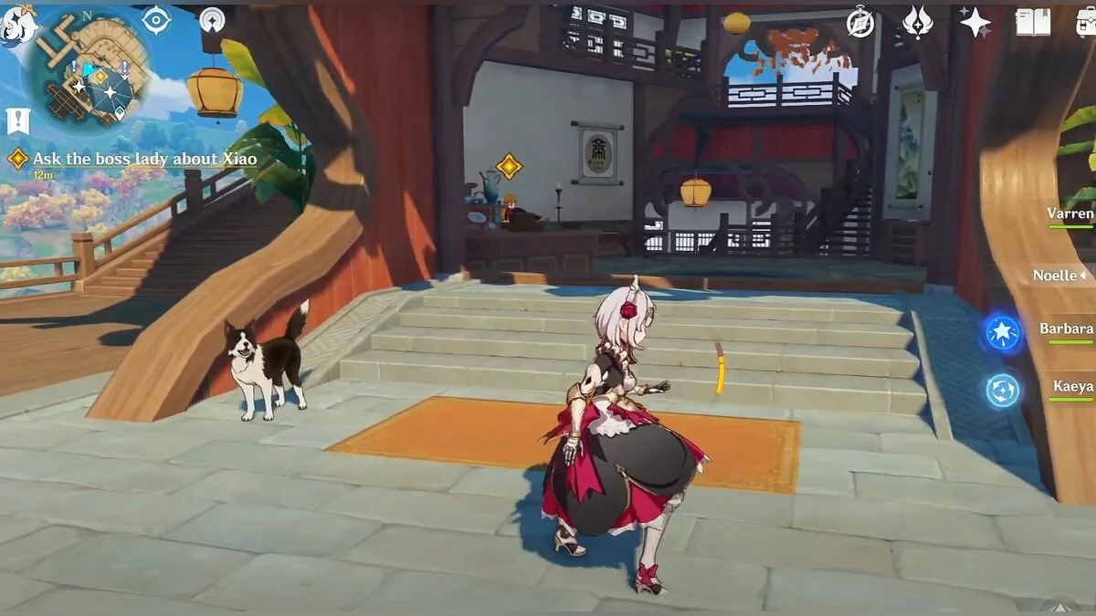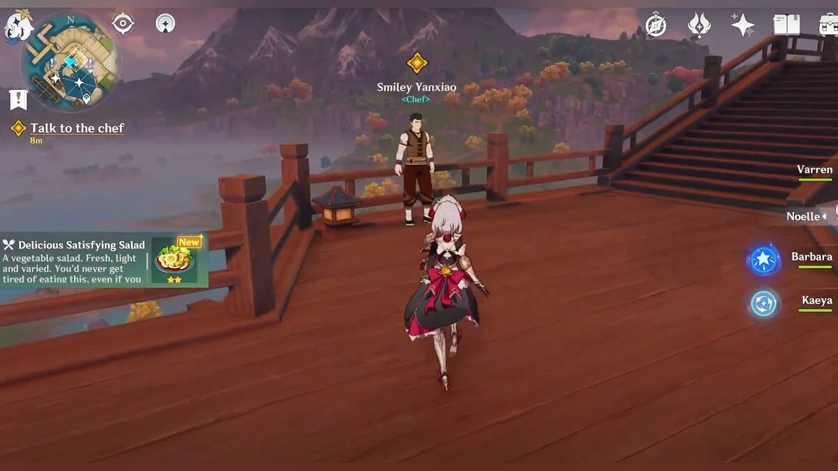 Поднимайтесь на второй этаж и поговорите с Сяо. Затем спускайтесь вниз и побеседуйте с Верр Голдет, которая сидит за стойкой. От неё вы узнаете, что нужно приготовить миндальный тофу. Выходите из помещения и поворачивайте направо. Поговорите с поваром Янь Сяо.
