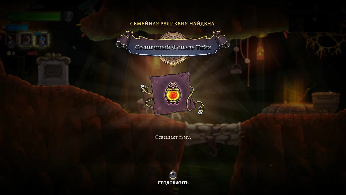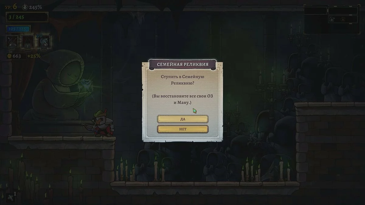 Стоит отметить, что встреча с семейной реликвией — неплохой шанс восполнить очки здоровья и маны. Выполните испытание без получения урона, чтобы вернуться в основной мир с максимальным количеством HP.