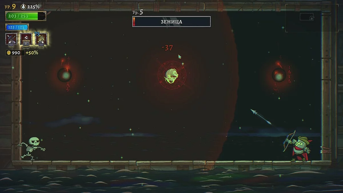 Во время испытания у вас уже будет разблокирован двойной прыжок. Используйте его, чтобы подняться наверх и переместиться в другую комнату. Когда победите двух скелетов и зеницу, отправитесь в локацию с чемпионами. Здесь придётся использовать двойной прыжок, чтобы уворачиваться от огненных шаров.