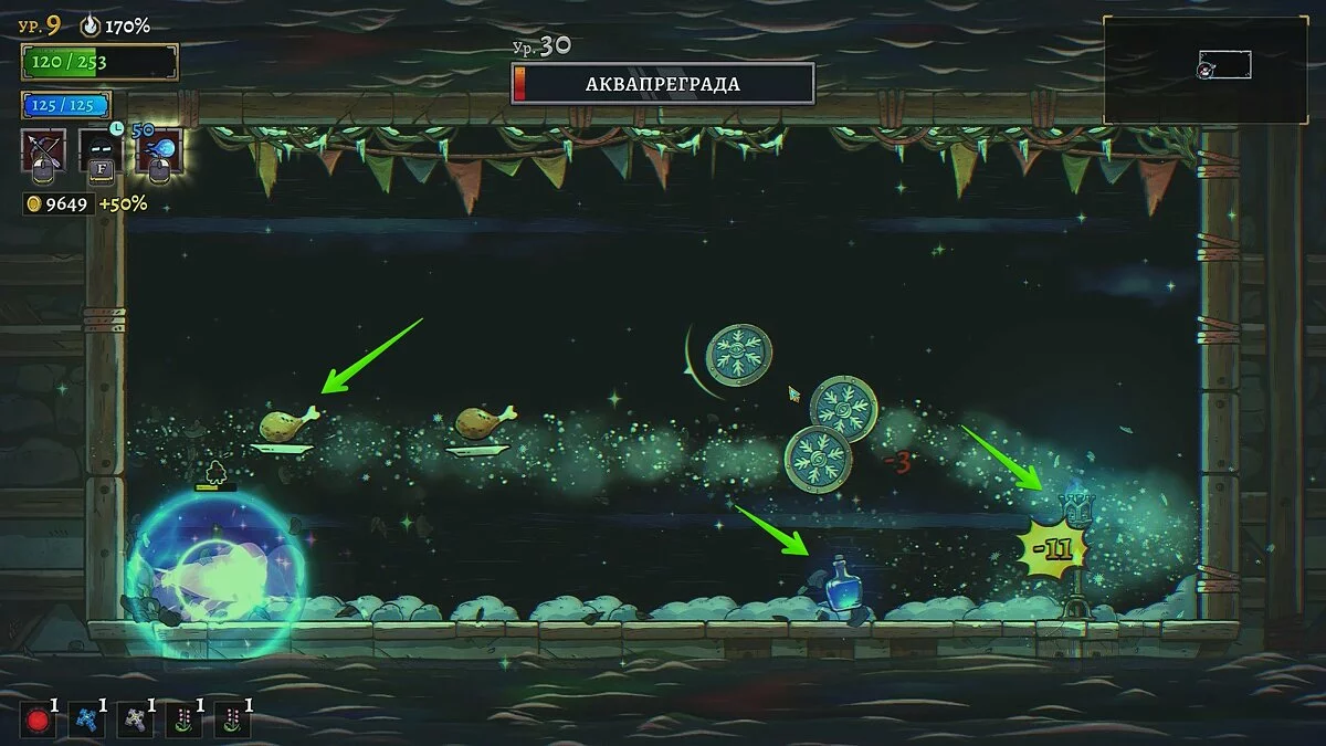 В следующей комнате вас ждёт битва с несколькими аквапреградами. Эти враги быстро перемещаются и обладают большим запасом здоровья, поэтому вовремя уворачивайтесь и используйте двойной прыжок. Обратите внимание, что справа и слева находятся факелы. Разбейте их, чтобы восстановить HP и ману.