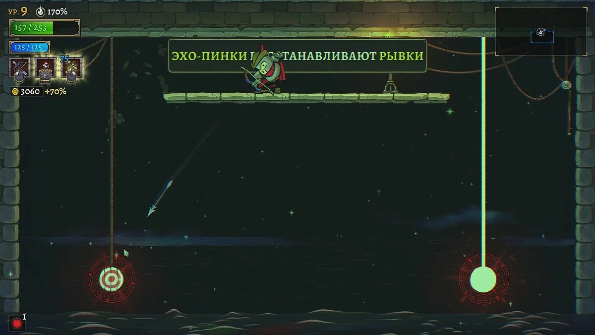 В следующей комнате нужно опуститься вниз и использовать рывок в воздухе, чтобы добраться до платформ у воды и уничтожить монстров. По такому же принципу разберитесь с врагами в последней локации, пройдите небольшую полосу препятствий и заберите реликвию.