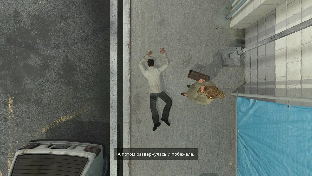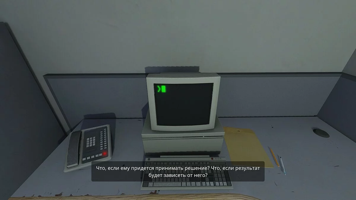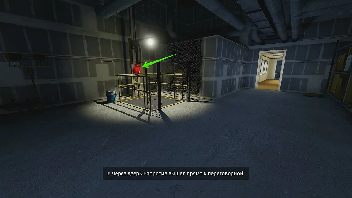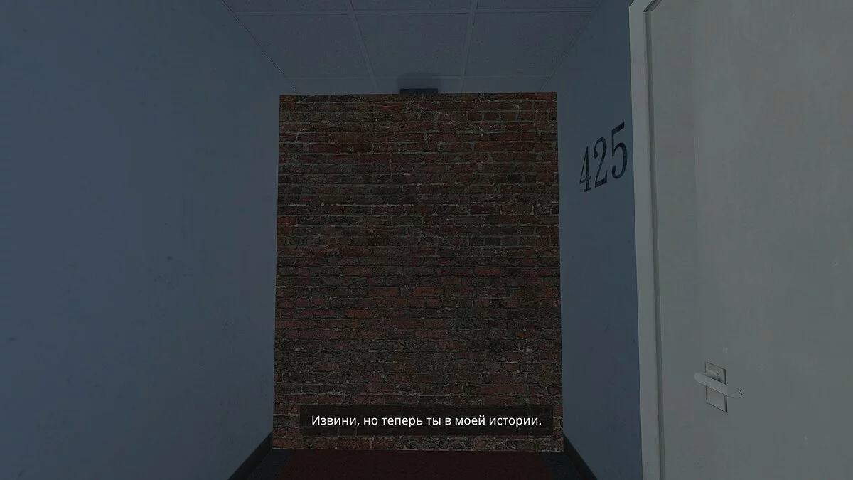 Покиньте офис и войдите в дверь слева. Пройдите по переговорной и спуститесь по лестнице вниз. Как только дверь за вами закроется, можете прекратить движение. С этого момента и до конца монолога Рассказчика локация будет зациклена. После небольшой кат-сцены игра перезапустится.