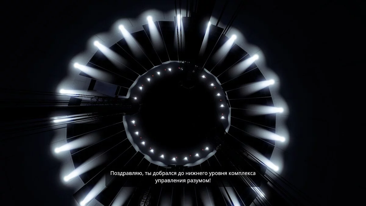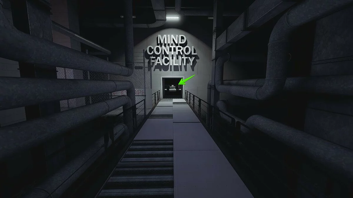 Войдите в лифт и нажмите кнопку «вниз». Пройдите через двойную дверь с надписью «Комплекс управления разумом» (Mind Control Facility), затем включите свет и камеры. Когда попадёте в центр управления, следуйте в соседнюю комнату и выслушайте Рассказчика. Он предложит отключить устройство и освободиться. Нажмите на кнопку OFF и дождитесь, пока откроется проход.