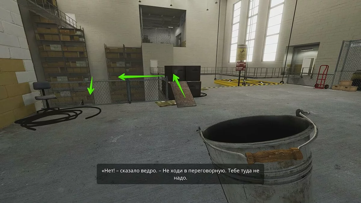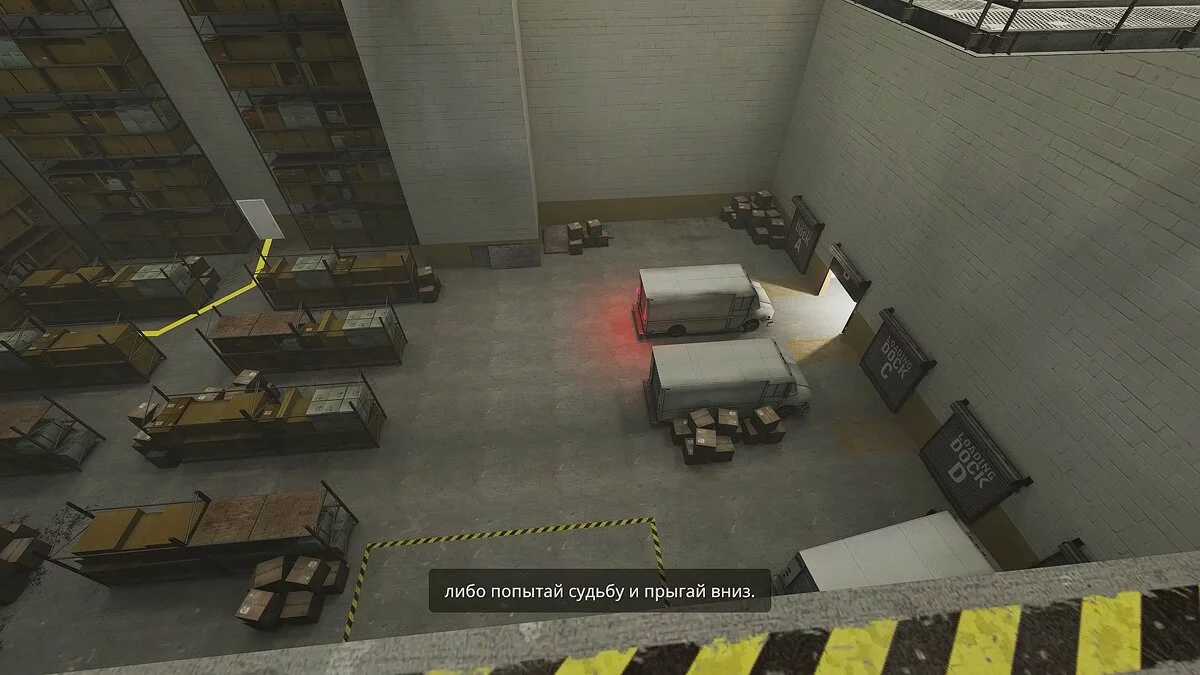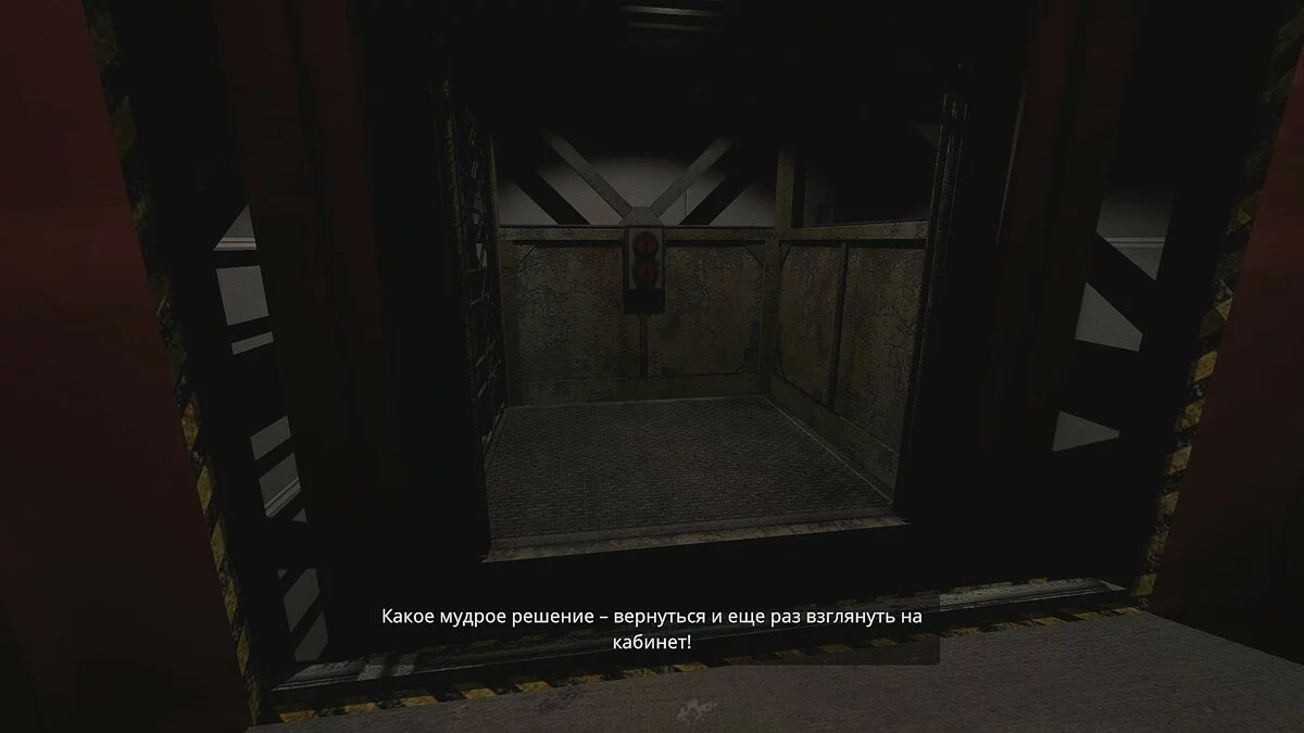 Пройдите через правую дверь, встаньте на грузовой подъёмник и сразу же вернитесь обратно. Рассказчик предупредит, что двери в офис заблокированы, а подъёмник не вернётся. Он предложит попытать удачу и спрыгнуть вниз. Сделав это, игра перезапустится.