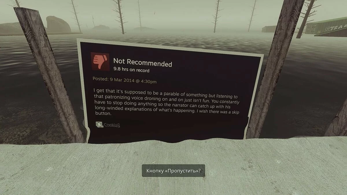 Покиньте комнату и заберитесь в вентиляционную шахту. Когда вы доберётесь до последнего негативного отзыва, Рассказчик решит ввести в игру кнопку «Пропустить».