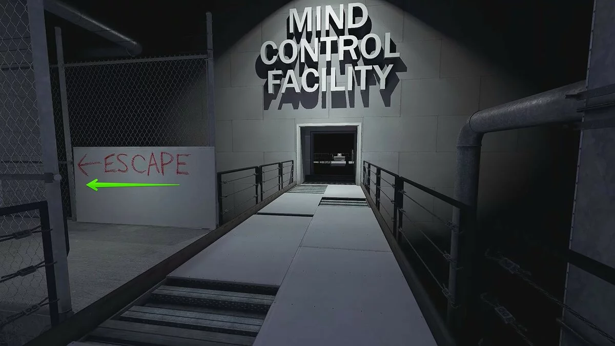 Следуйте указаниям Рассказчика: войдите в дверь слева, поднимитесь в кабинет босса и спуститесь на лифте вниз. Справа от двери с надписью «Комплекс управления разумом» (Mind Control Facility) вы увидите табличку «Выход» (Escape).
