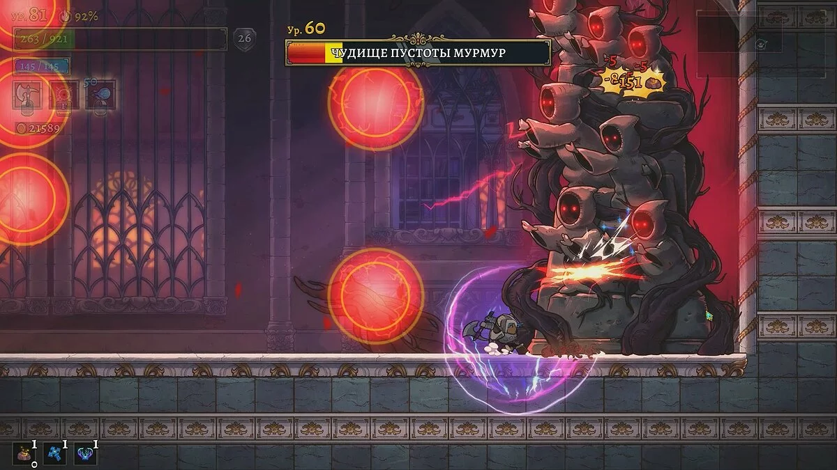 В комнате с врагом вы столкнётесь с резонансными шарами и преградами пустоты, которые выпускает Чудище. Преграды фиолетового цвета можно преодолеть с помощью рывка пустоты, а резонансные шары уничтожить не удастся. Вам придётся использовать пинки, чтобы взбираться выше и перепрыгивать их (если шар сверху отсутствует). Иногда будут отсутствовать шары снизу, что упростит задачу. В любом случае мы рекомендуем отправиться к боссу с большим количеством здоровья.