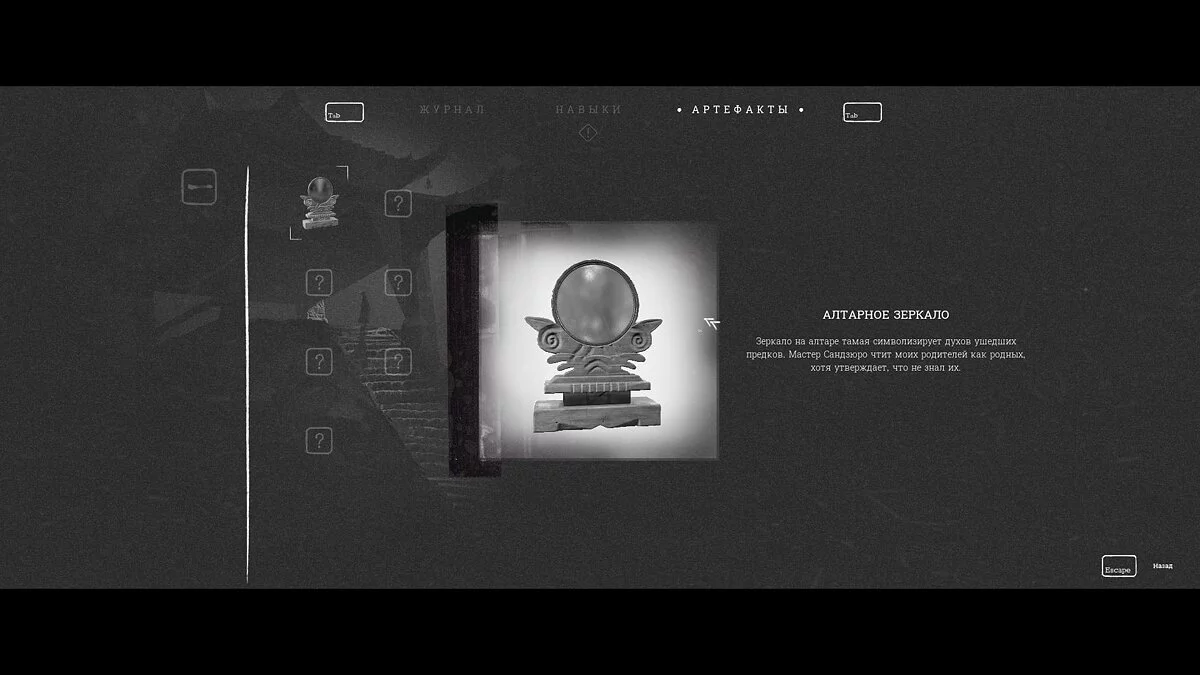 Первый артефакт можно найти сразу после завершения обучения. Оказавшись снаружи додзё, герой должен развернуться и пробежать через здание, в котором проходило обучение. Снова попав на улицу, необходимо пройти вправо до беседки, в которой разговаривают два персонажа. Здесь можно обнаружить «Алтарное Зеркало».