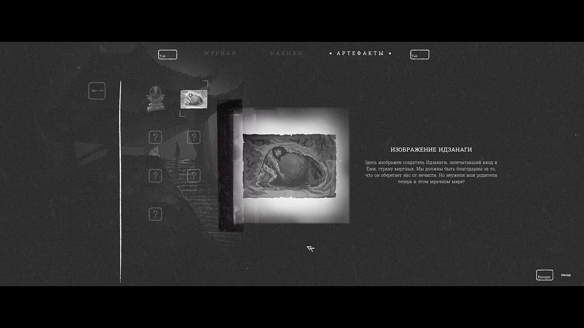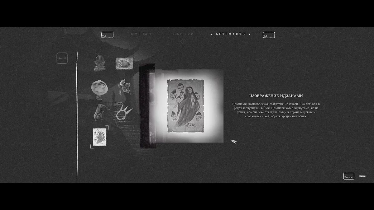 Последний артефакт первой главы находится уже за воротами деревни. После того как Хироки обезвредит двух бандитов, пытающихся попасть в деревню, необходимо свернуть налево и бежать по дороге от ворот. Добравшись до перекрёстка, сверните направо и продолжайте идти до небольшого кладбища. Там на героя нападут несколько врагов. После драки продвигайтесь в правую часть локации, пока не достигните финальной карты. В её правой стороне вы найдете «Изображение Идзанами».