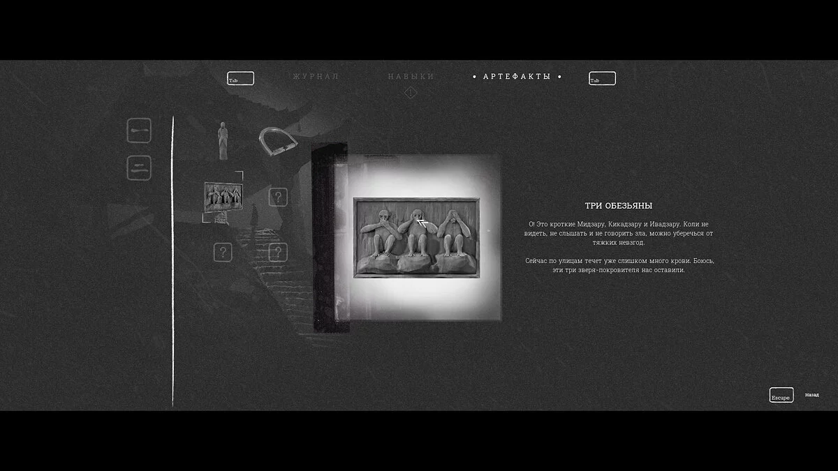 Выйдя из пещеры наружу, герой должен пересечь мост из упавшего дерева через пропасть. Прямо за деревом сверните налево, к водопаду. На стене справа будет каменная фреска с изображением «Трёх обезьян». Взаимодействуйте с фреской, чтобы собрать её как артефакт.