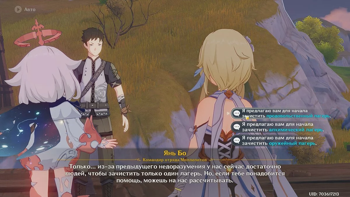 Если это условие выполнено, то следуйте в Долину лесозаготовок и поговорите с Янь Бо. Командир отряда Миллелитов попросит разобраться с похитителями сокровищ, которые захватили оружейный, продовольственный и алхимический лагеря. Можете выбрать, в какой лагерь отправить отряд Миллелитов, но это не повлияет на сюжет.