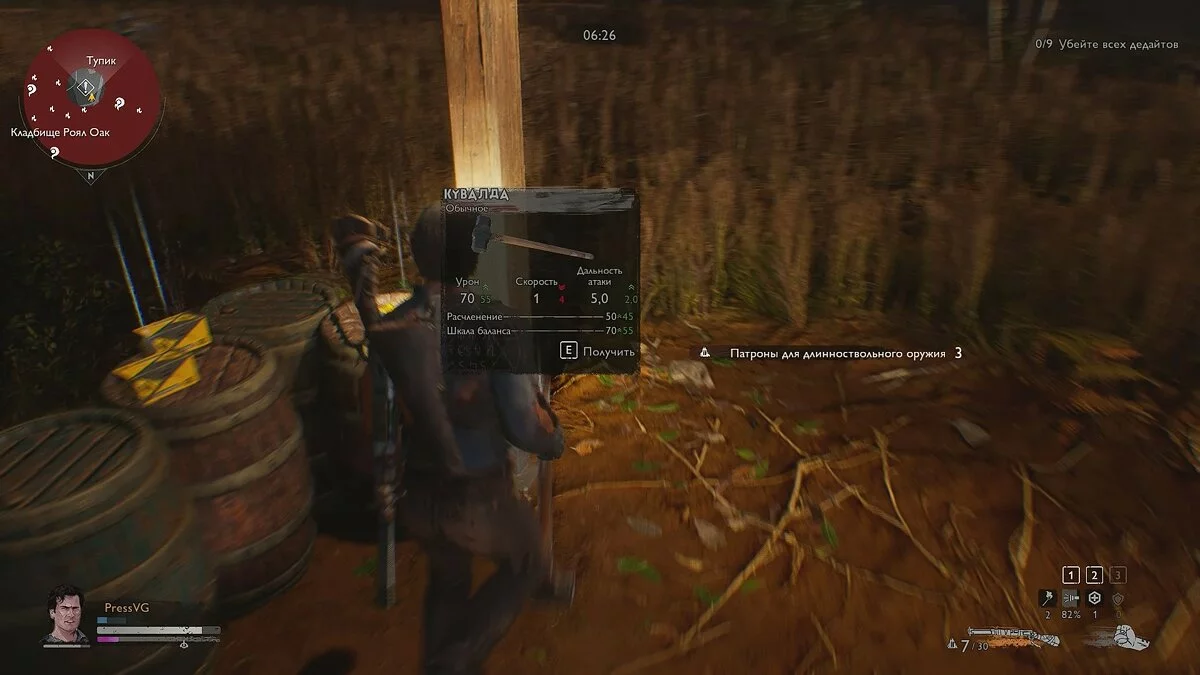 В начале испытания не спешите садиться в машину и направляться к первой области. Сперва осмотрите ферму. Здесь можно найти патроны для винтовки, аптечки и один амулет. Медлить тоже не стоит, так как на выполнение задания выделено всего 12 минут.