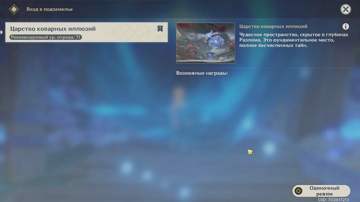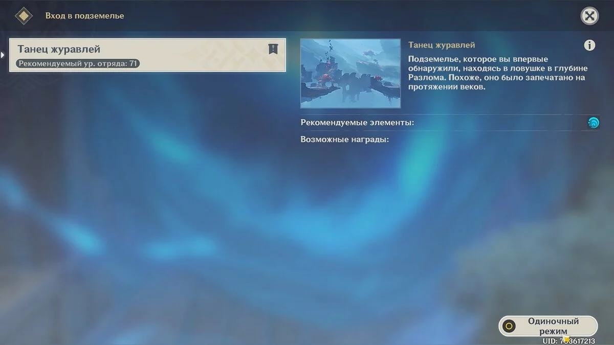 Сперва побеседуйте с Е Лань и войдите в подземелье «Танец журавлей». В зависимости от вашего уровня мира вы увидите рекомендуемый уровень отряда. Пятый уровень мира потребует 71 уровень отряда. Так начнётся следующий квест «Подземный лабиринт».
