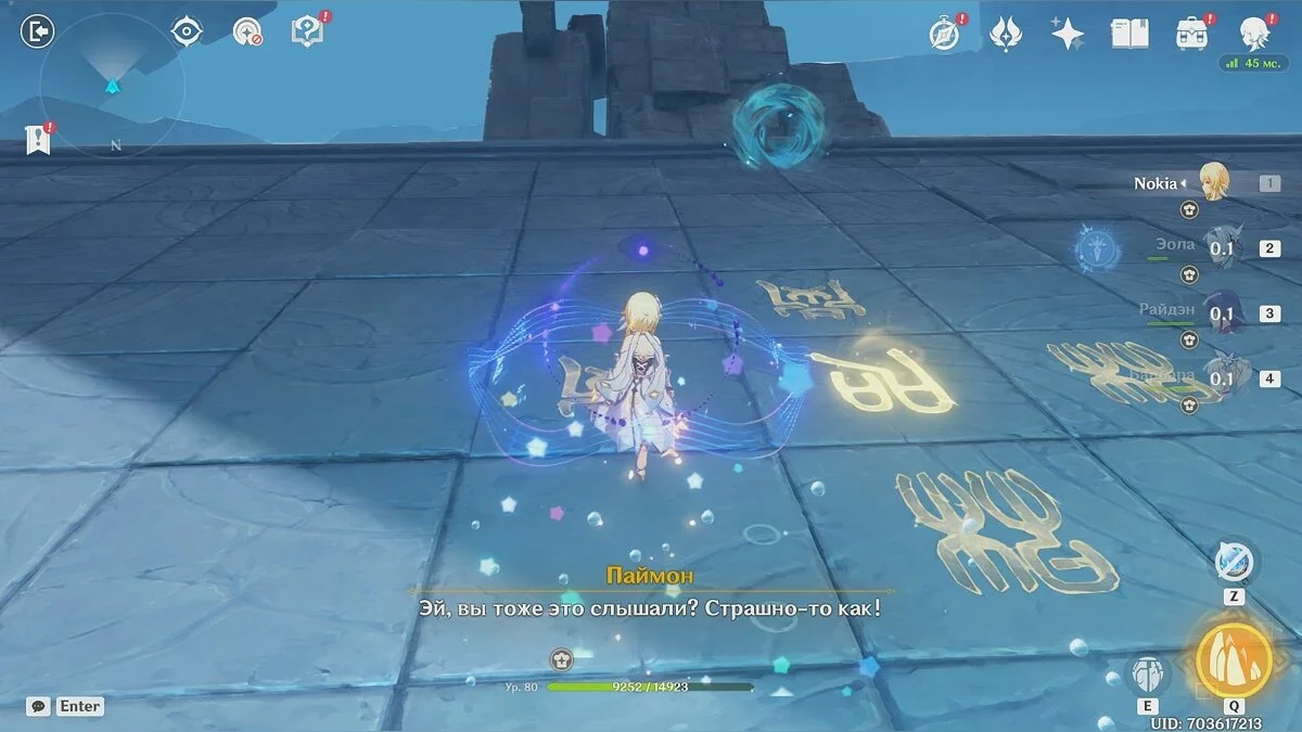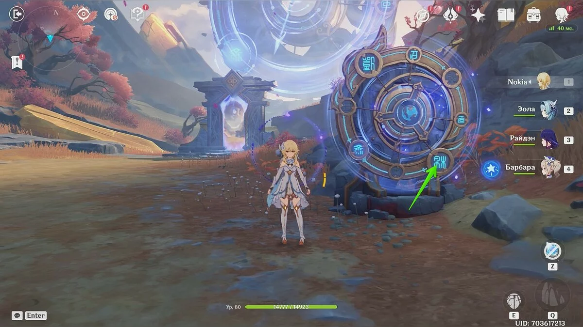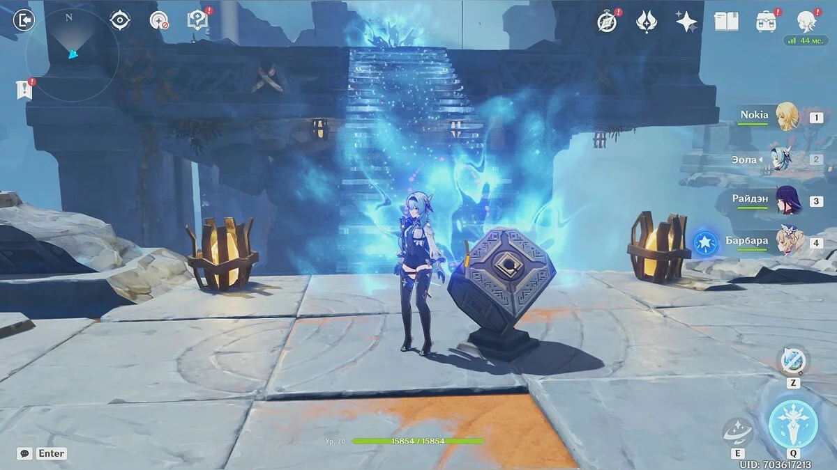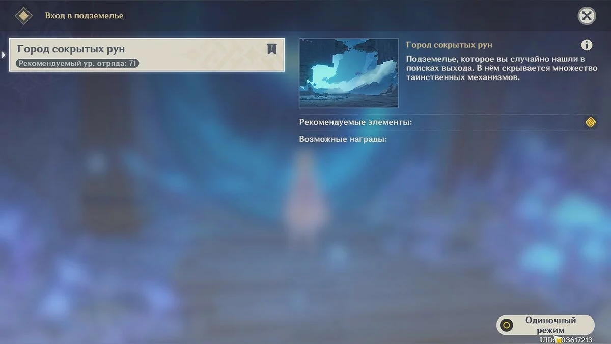 После завершения предыдущего задания откройте меню Паймон и подождите до следующего дня. Пообщайтесь с приятелями и отправляйтесь в следующий портал. Он ведёт к очередному подземелью «Город сокрытых рун». Предварительно рекомендуется снарядить хотя бы одного героя со стихией «Гео».