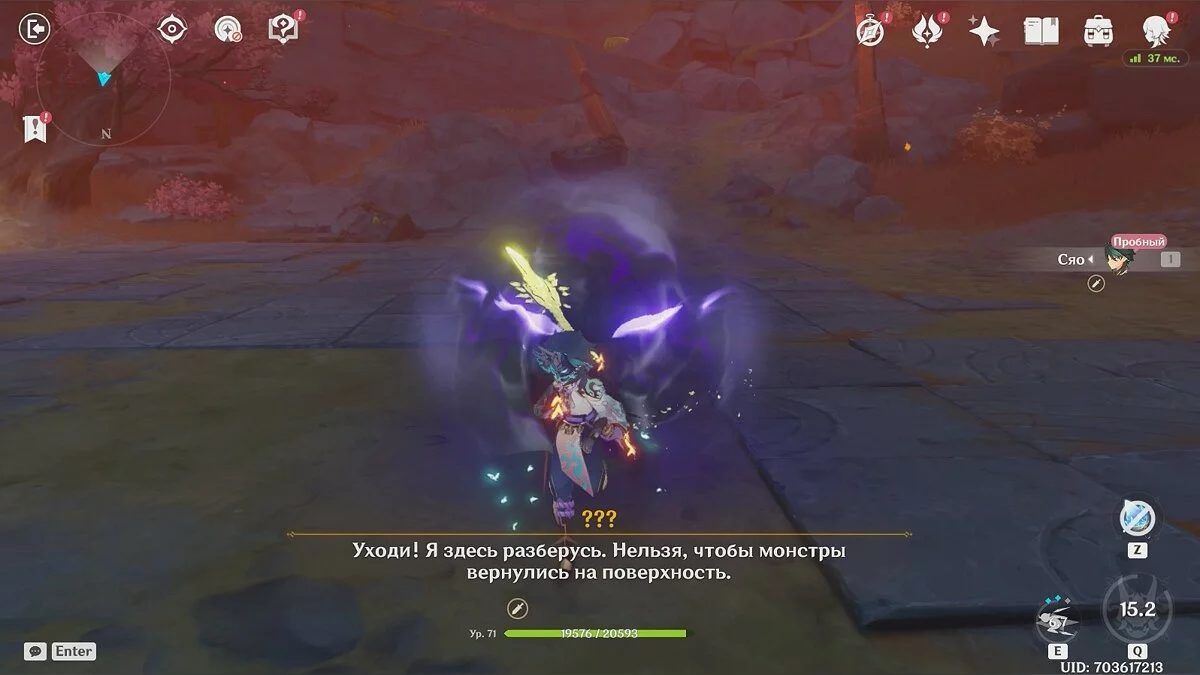 Сдвинув стрелку вперёд, войдите в новое измерение и сразитесь со злым духом. Для этого используйте элементальный навык Сяо и уклоняйтесь от атак врага. Когда Взрыв стихий будет заряжен, используйте его и атакуйте противника.