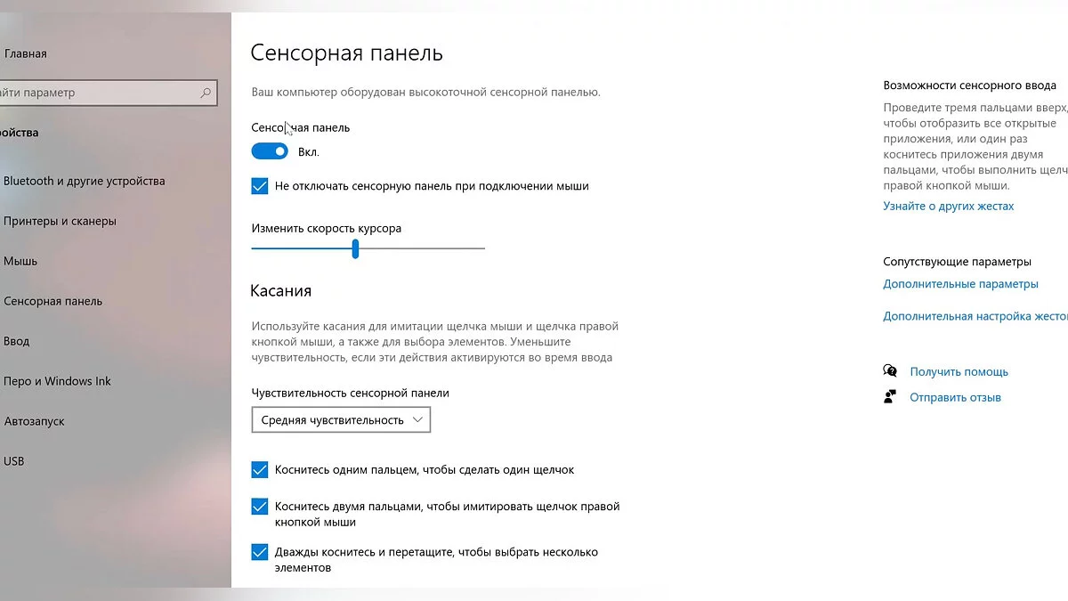 В этом же меню есть пункт «Не отключать сенсорную панель при подключении мыши». При снятии галочки тачпад будет автоматически выключаться при подсоединении компьютерной мыши. Также в этом разделе можно настроить активные действия на сенсорной панели и при необходимости отключить некоторые из них.