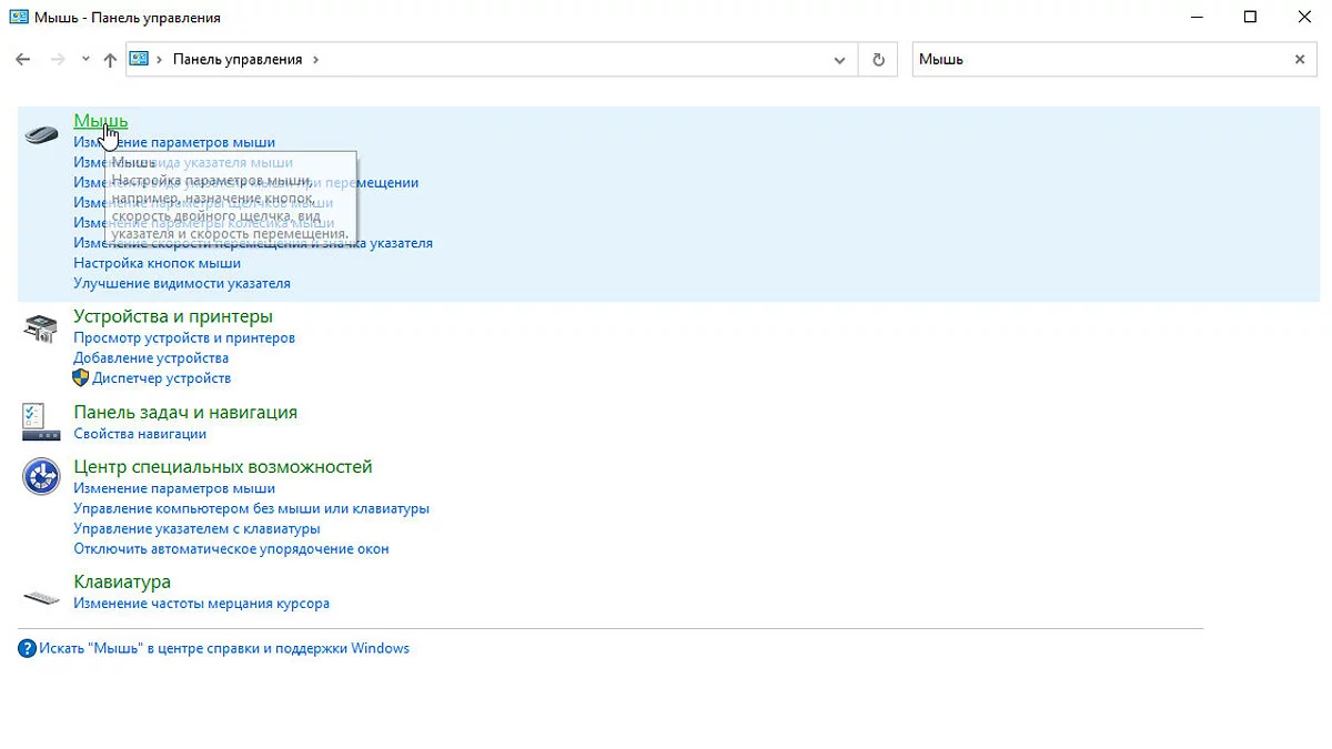 - В появившемся окне введите «Мышь» в строку поиска, расположенную в правом верхнем углу.