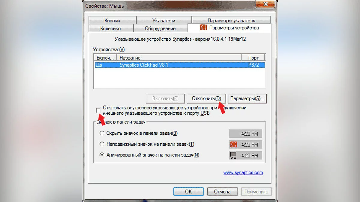 Как упоминалось ранее, на большинстве ноутбуков установлены сенсорные панели от компании Synaptics. При наличии таких тачпадов их можно отключить через соответствующие свойства. Выполните следующие действия: