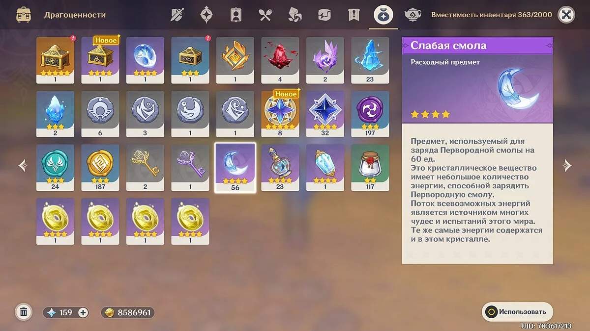 - Использование Слабой или Переходной смолы. За 1 штуку вы получите 60 единиц Первородной смолы. Всего в инвентаре может быть до 20 единиц Слабой смолы. Подробнее об этом ресурсе мы поговорим ниже.