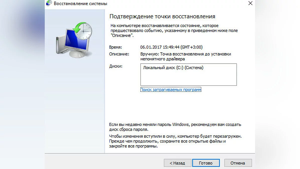 - Нажмите «Далее» и «Готово» для запуска процесса восстановления. По окончании процесса Windows запустится с предыдущей работоспособной версией.