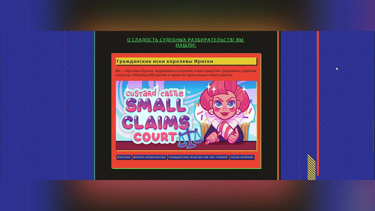- Решение: используем вкладку «Симуляторы колоний» и в разделе «Экономика» находим игру «Гражданские иски королевы Ириски». На постере изображена принцесса в розовых тонах с надписью «Custard Castle Small Claims Court».